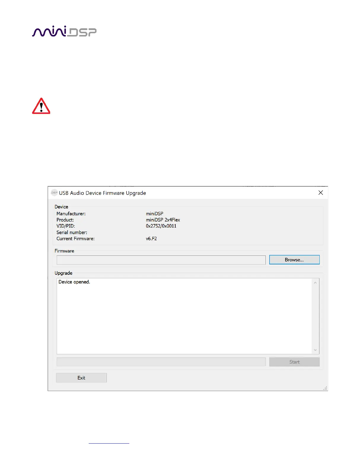 DO NOT DISCONNECT THE USB CABLE OR POWER FROM THE miniDSP Flex WHILE FIRMWARE UPGRADE