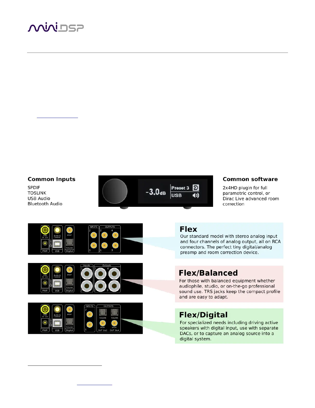 compact processor includes a full suite of miniDSP’s powerful audio processing tools and flexible I/O routing.