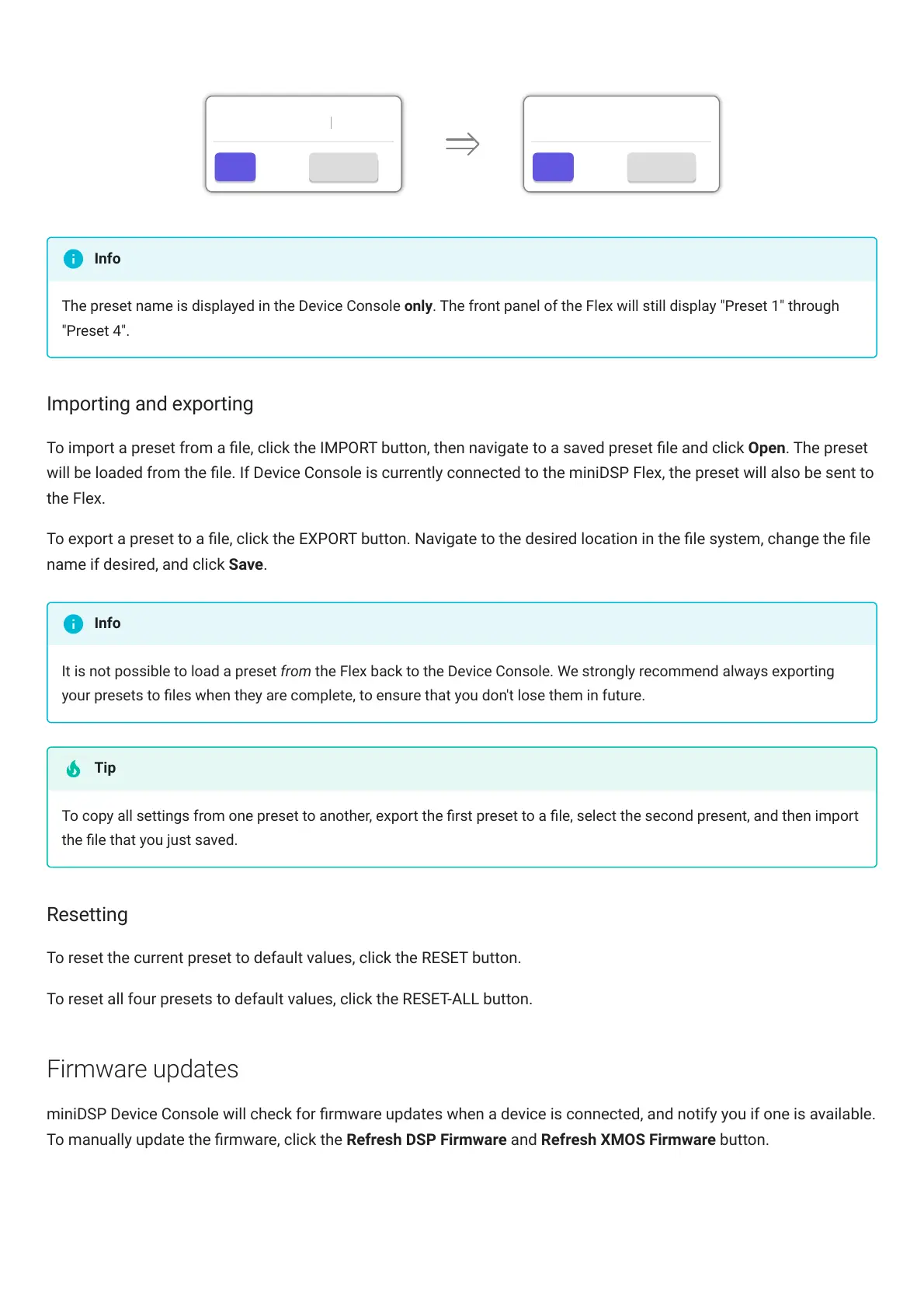 will be loaded from the le. If Device Console is currently connected to the miniDSPFlex, the preset will also be sent to