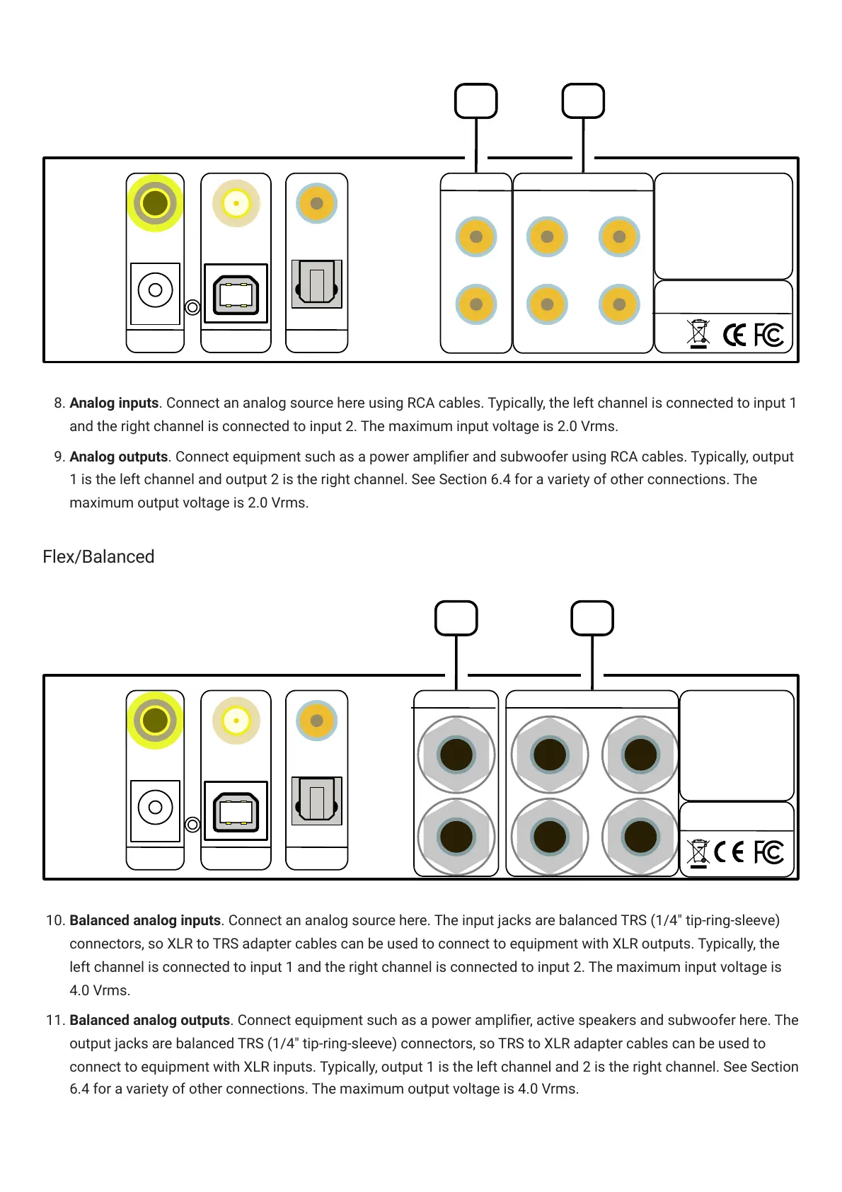 10. Balanced analog inputs. Connect an analog source here. The input jacks are balanced TRS (1/4" tip-ring-sleeve)