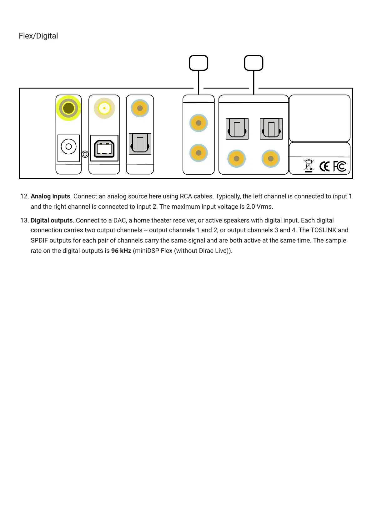12. Analog inputs. Connect an analog source here using RCA cables. Typically, the left channel is connected to input 1
