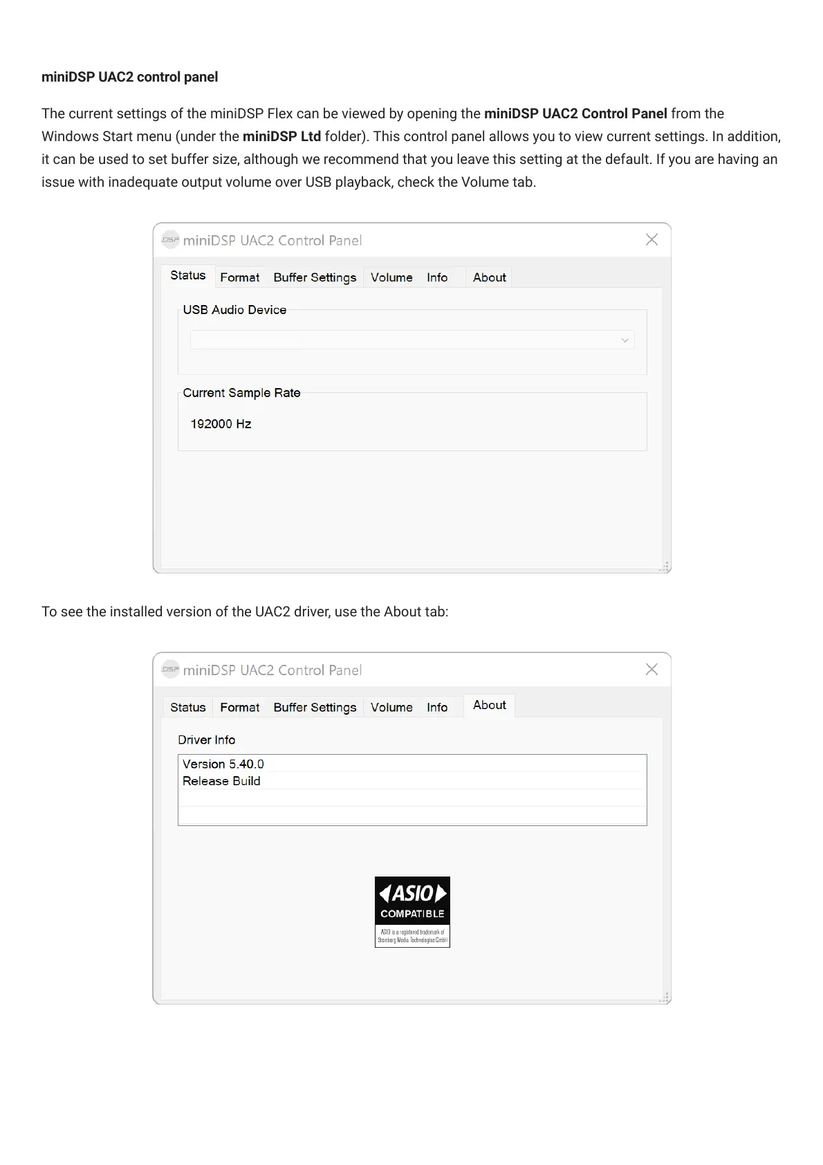 The current settings of the miniDSPFlex can be viewed by opening the miniDSP UAC2 Control Panel from the