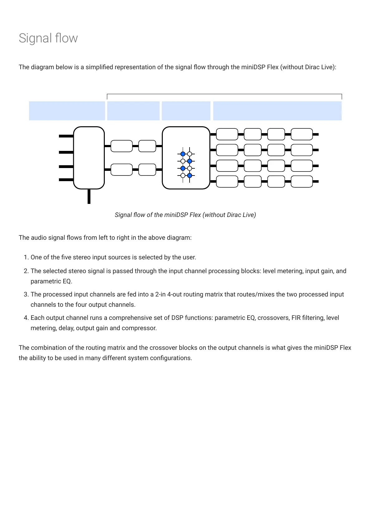 The combination of the routing matrix and the crossover blocks on the output channels is what gives the miniDSPFlex