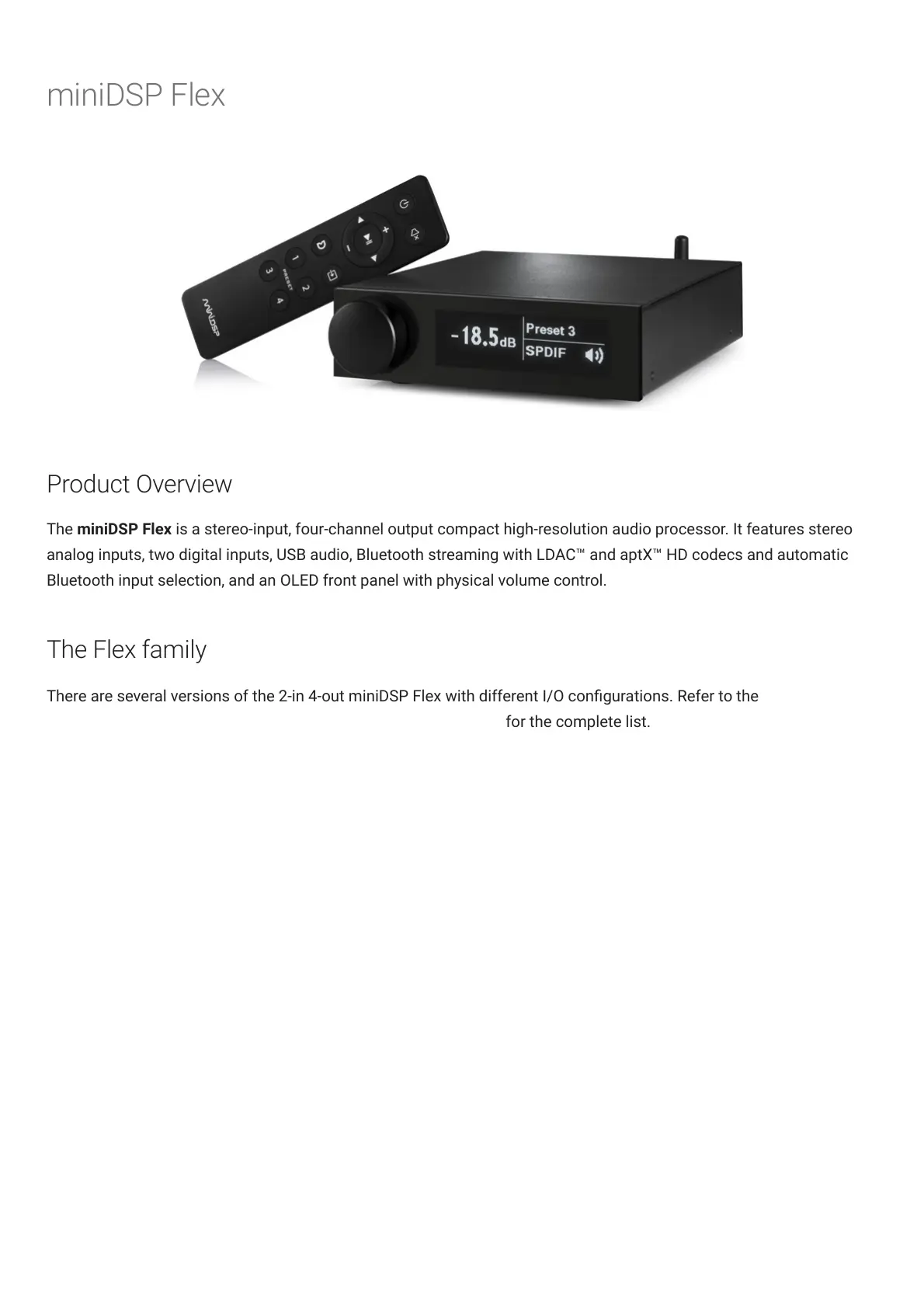 There are several versions of the 2-in 4-out miniDSP Flex with different I/O congurations. Refer to the Flex product