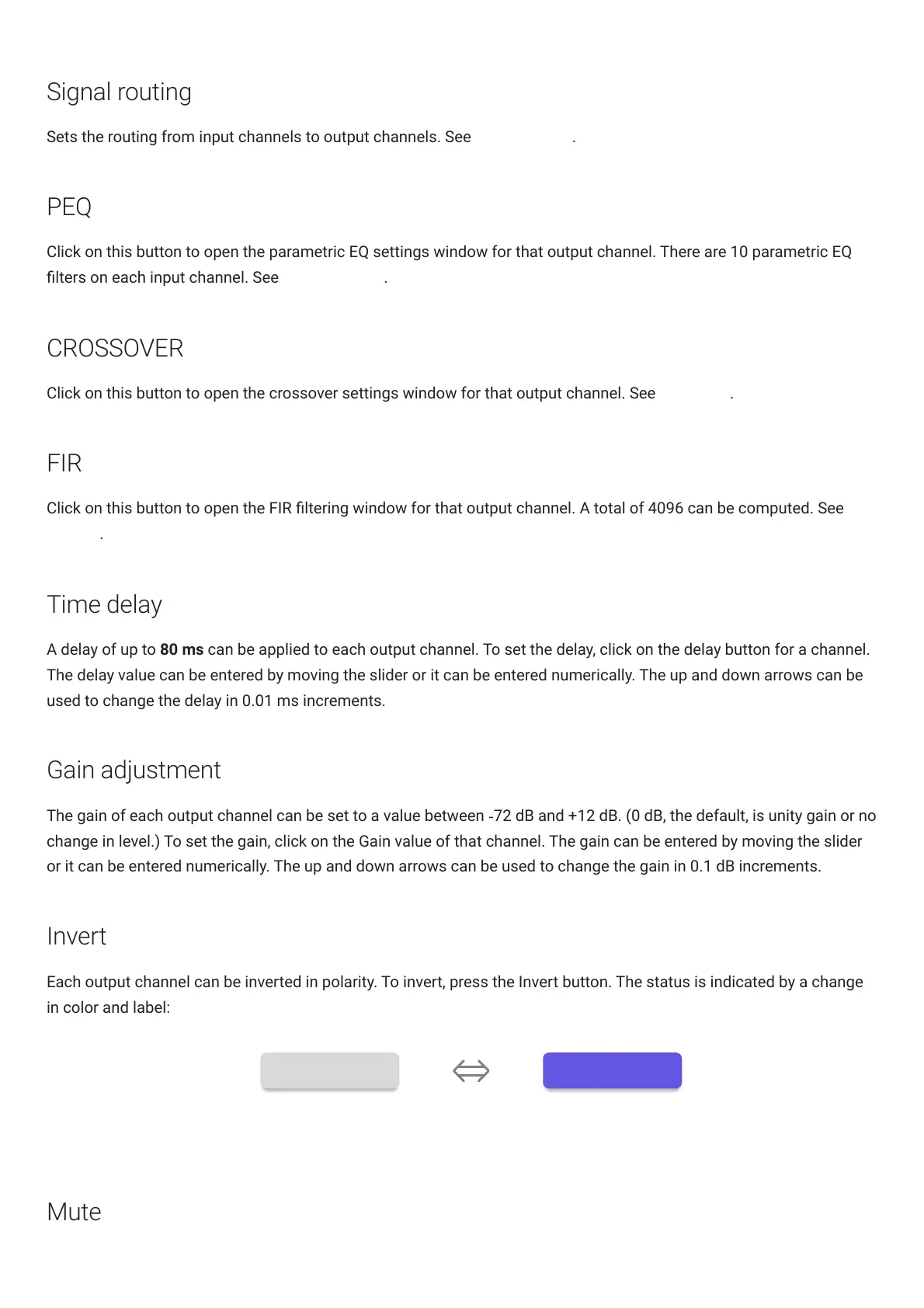 The gain of each output channel can be set to a value between ‑72dB and +12dB. (0 dB, the default, is unity gain or no