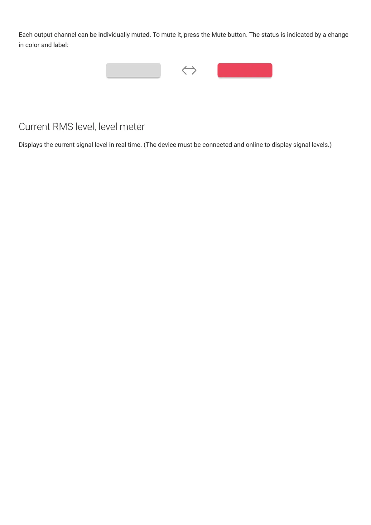 Each output channel can be individually muted. To mute it, press the Mute button. The status is indicated by a change