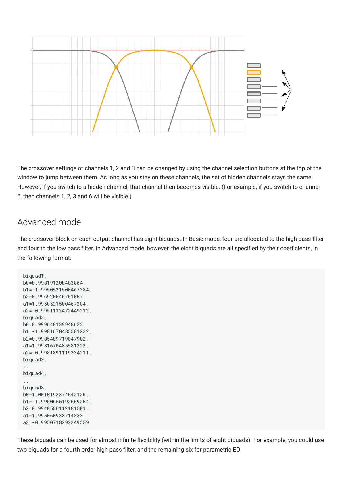 The crossover block on each output channel has eight biquads. In Basic mode, four are allocated to the high pass lter