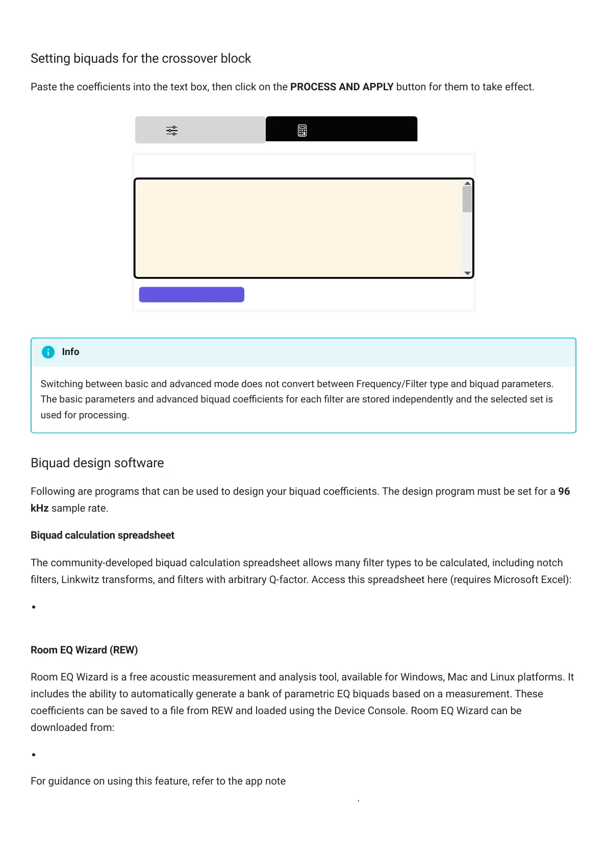 Setting biquads for the crossover block