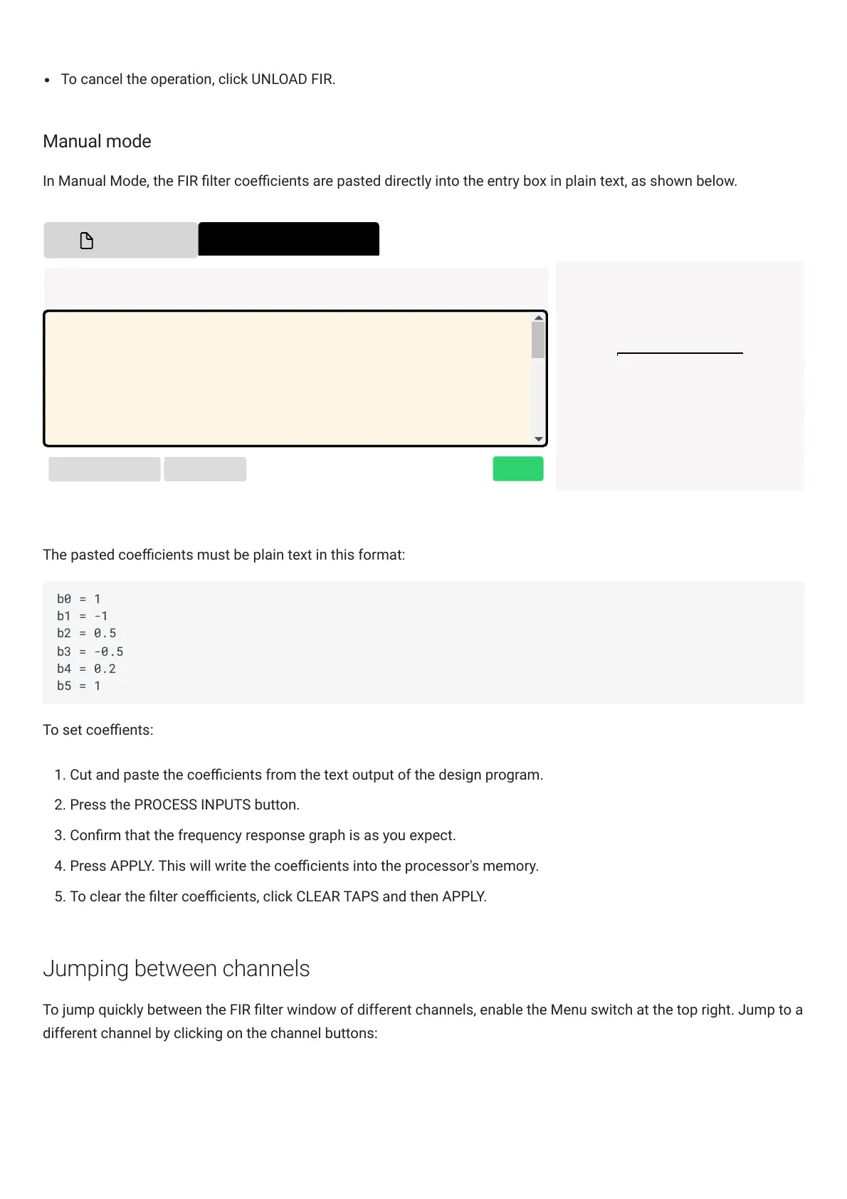In Manual Mode, the FIR lter coecients are pasted directly into the entry box in plain text, as shown below.