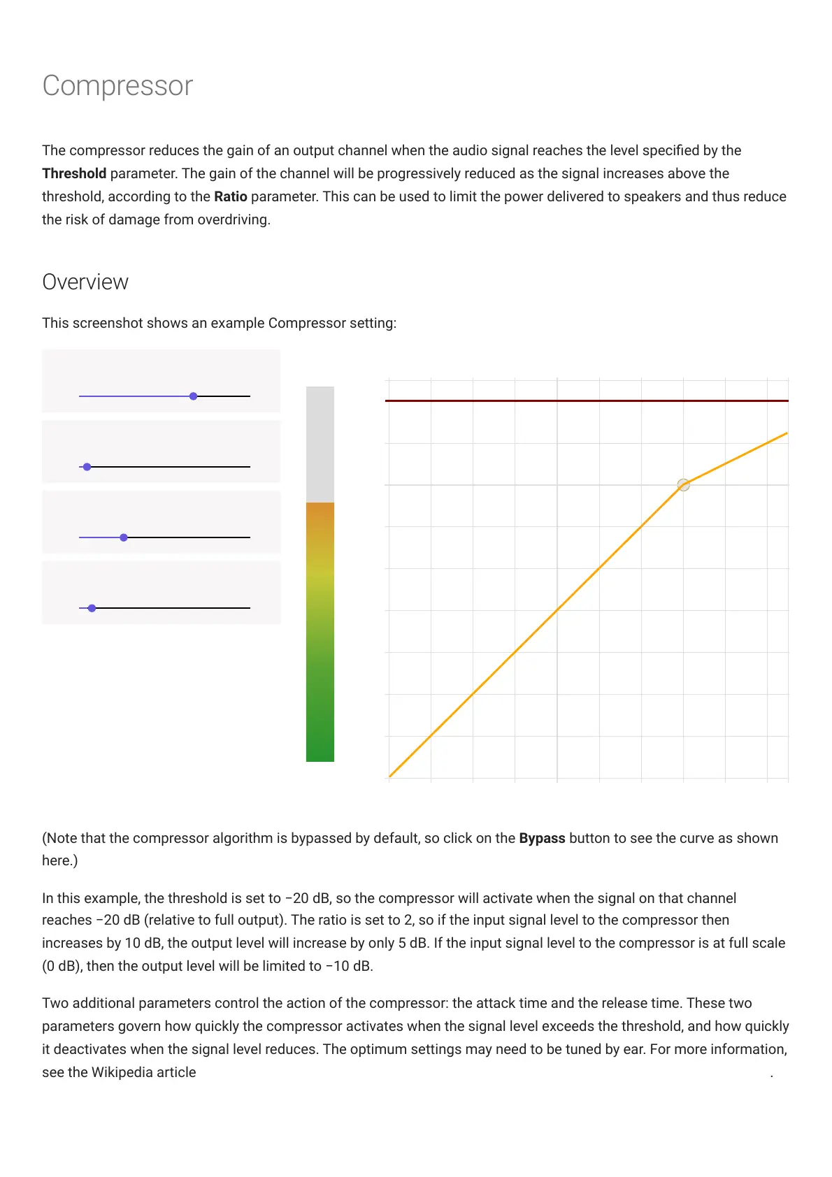 The compressor reduces the gain of an output channel when the audio signal reaches the level specied by the