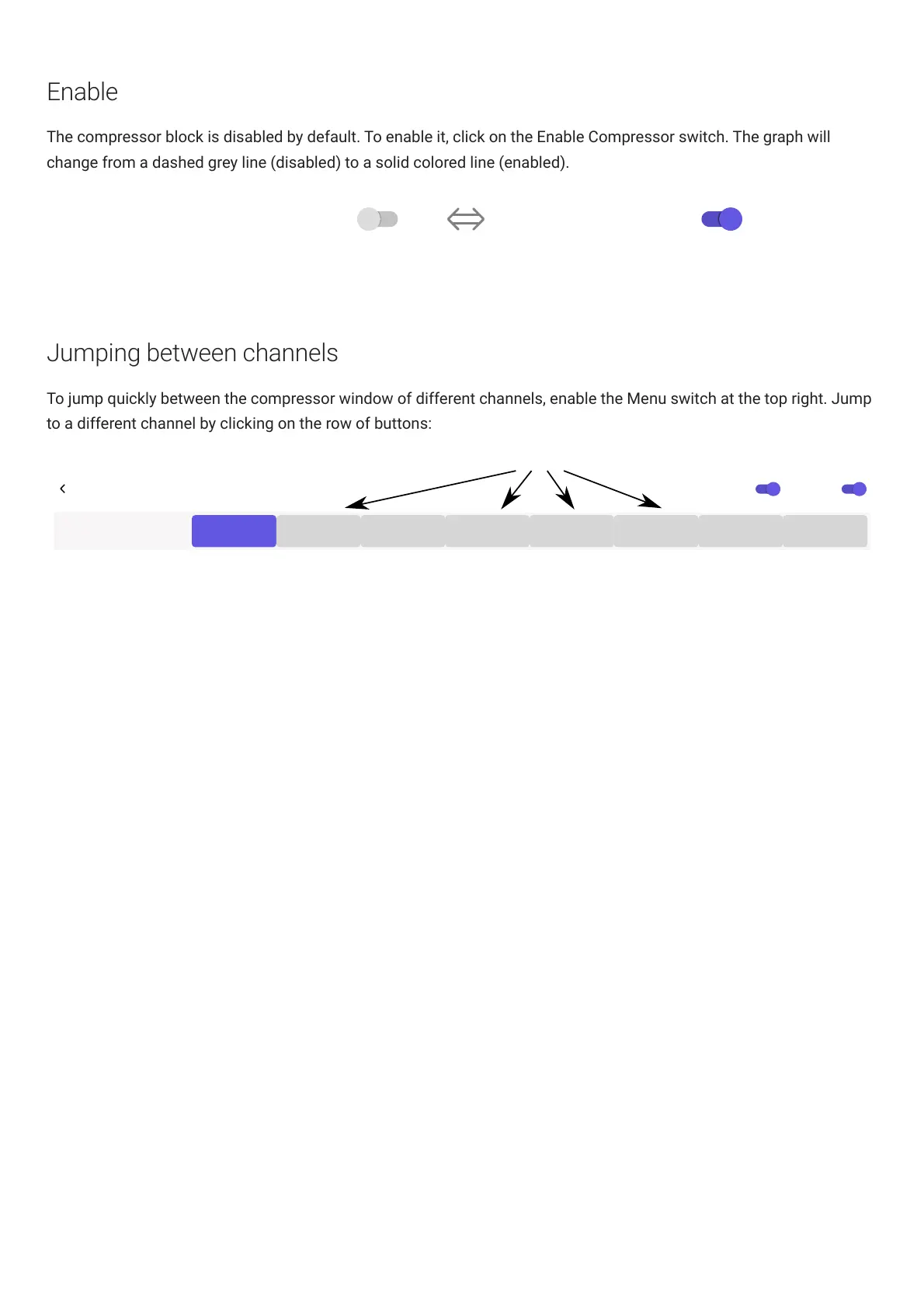 To jump quickly between the compressor window of different channels, enable the Menu switch at the top right. Jump