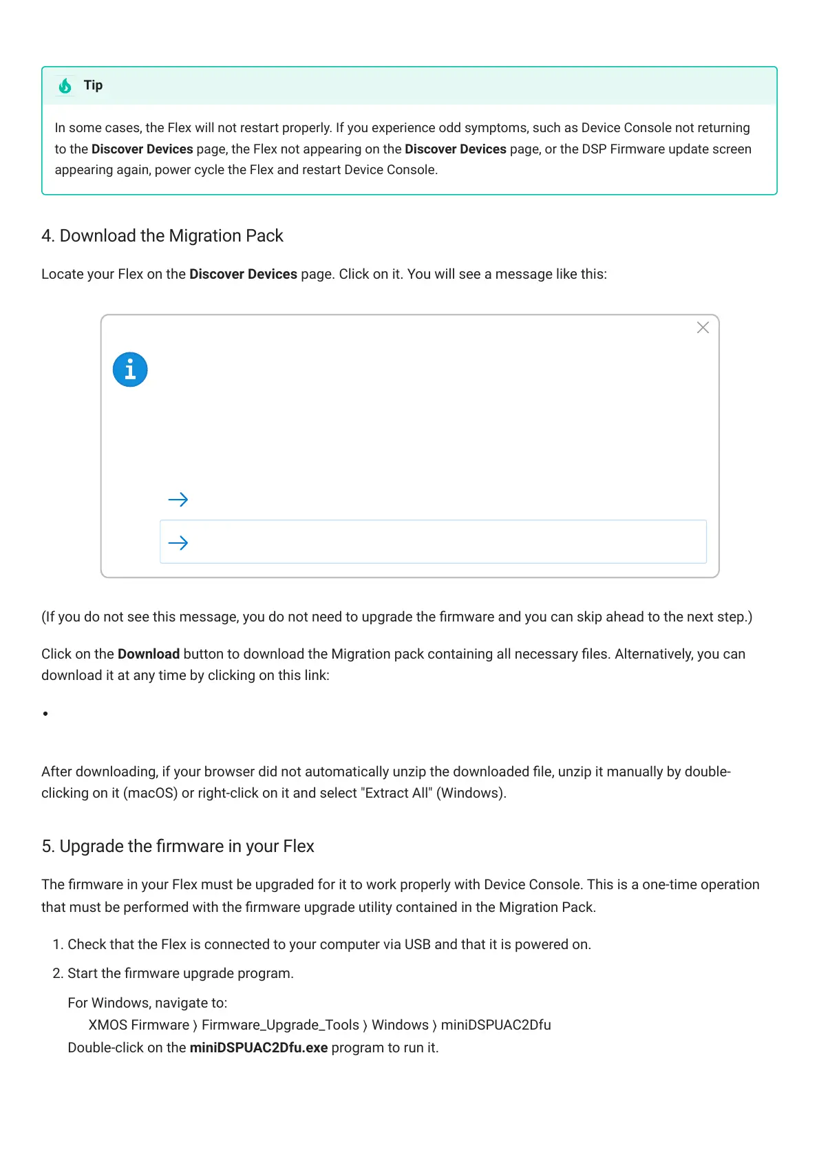 to the Discover Devices page, the Flex not appearing on the Discover Devices page, or the DSP Firmware update screen