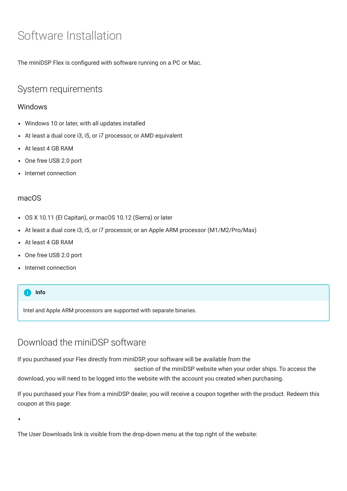 If you purchased your Flex directly from miniDSP, your software will be available from the User Downloads
