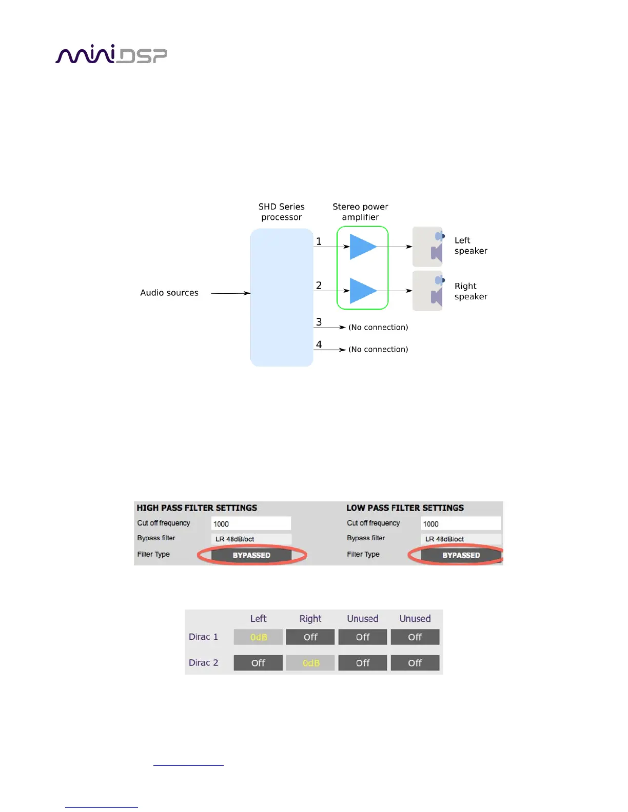• Check that the crossover filters of channels 1 and 2 (“Left” and “Right”) are bypassed: