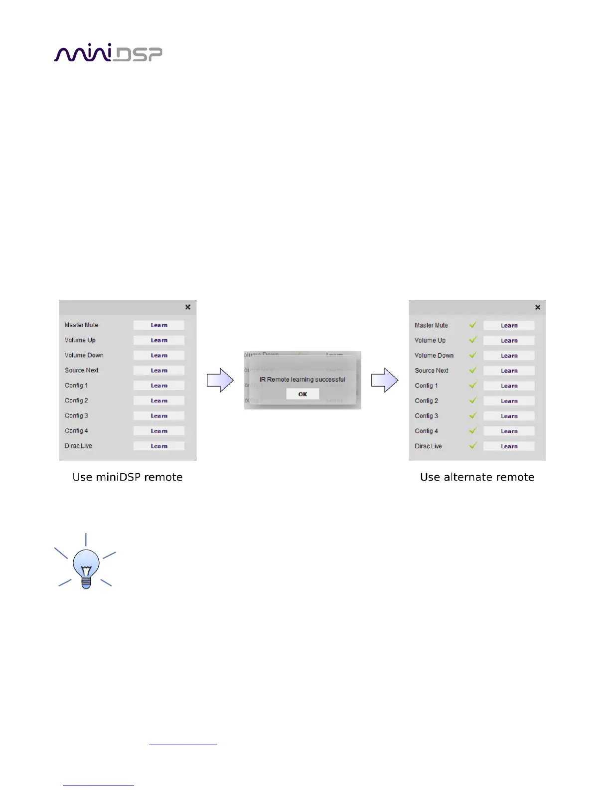 to using the miniDSP remote, unlearn all commands. Note that you cannot “learn” the miniDSP