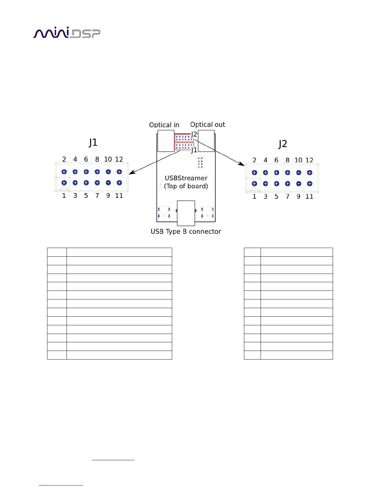 The USBStreamer circuit board has two 12-pin headers located between the optical ports. All I2S lines are on J1,