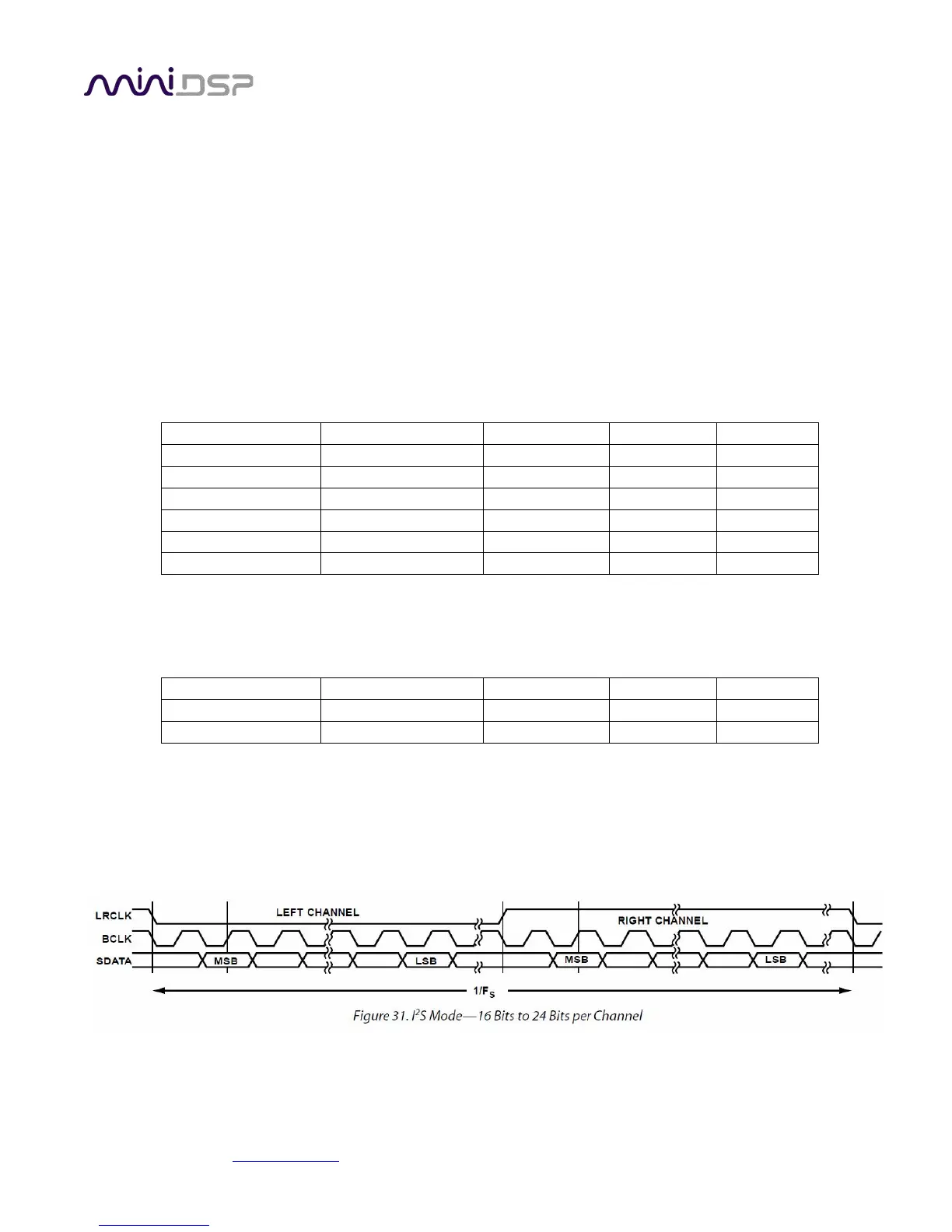 Each line carries two audio channels, in either 16-bit or 24-bit format. The expected I2S data format and timing is