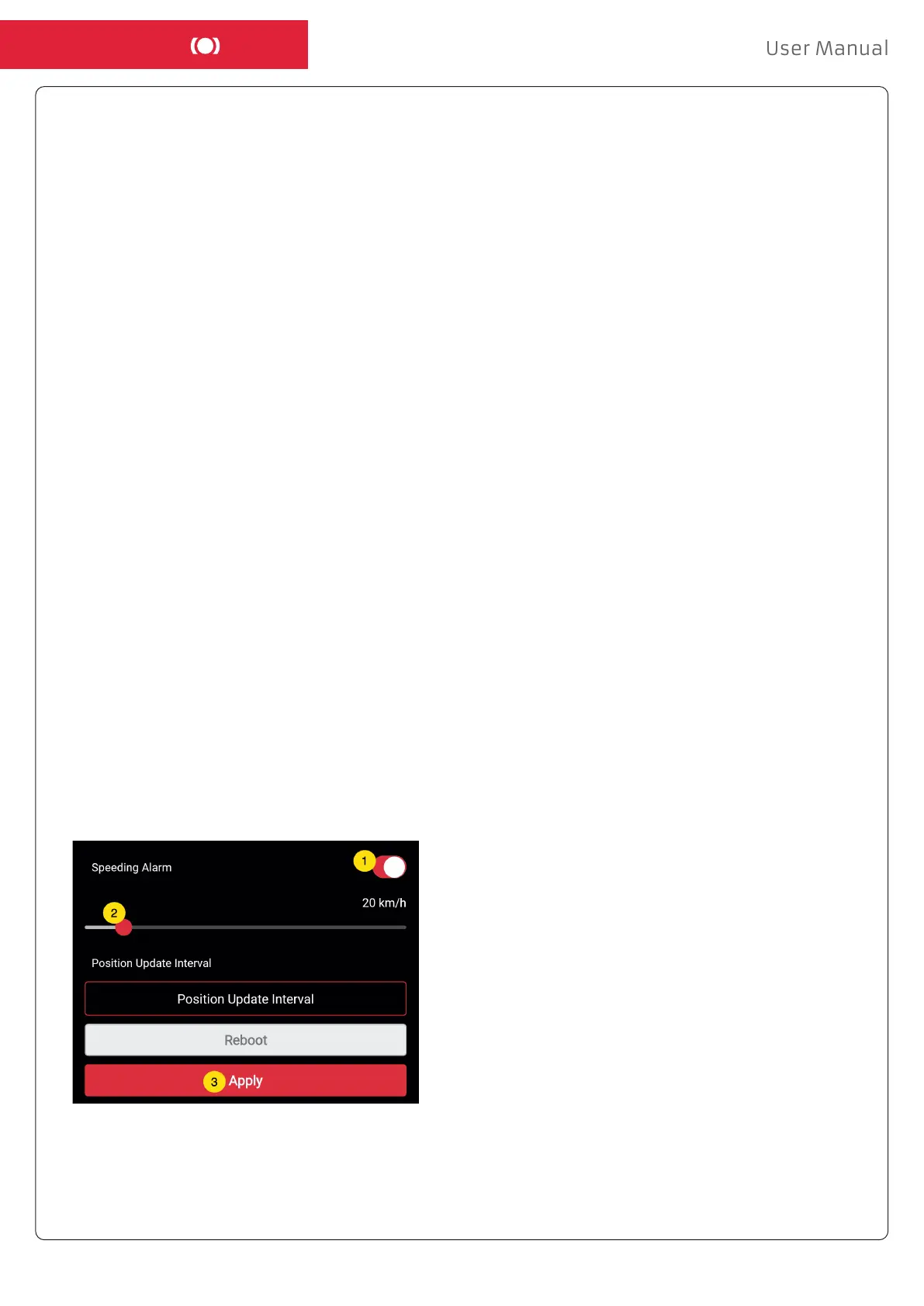 Activate ”Speeding Alarm” (1). Drag the circle to a desired speed (2). Finally, click “Apply” (3) to