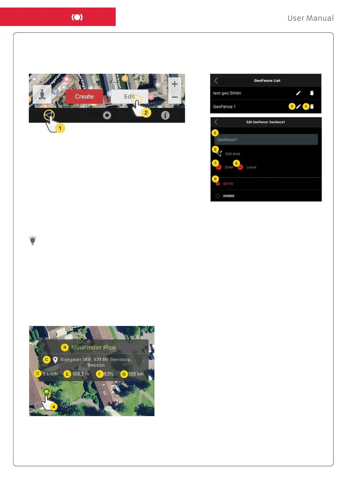 - Create/Change a Geofence area’s name (5) in the text eld.