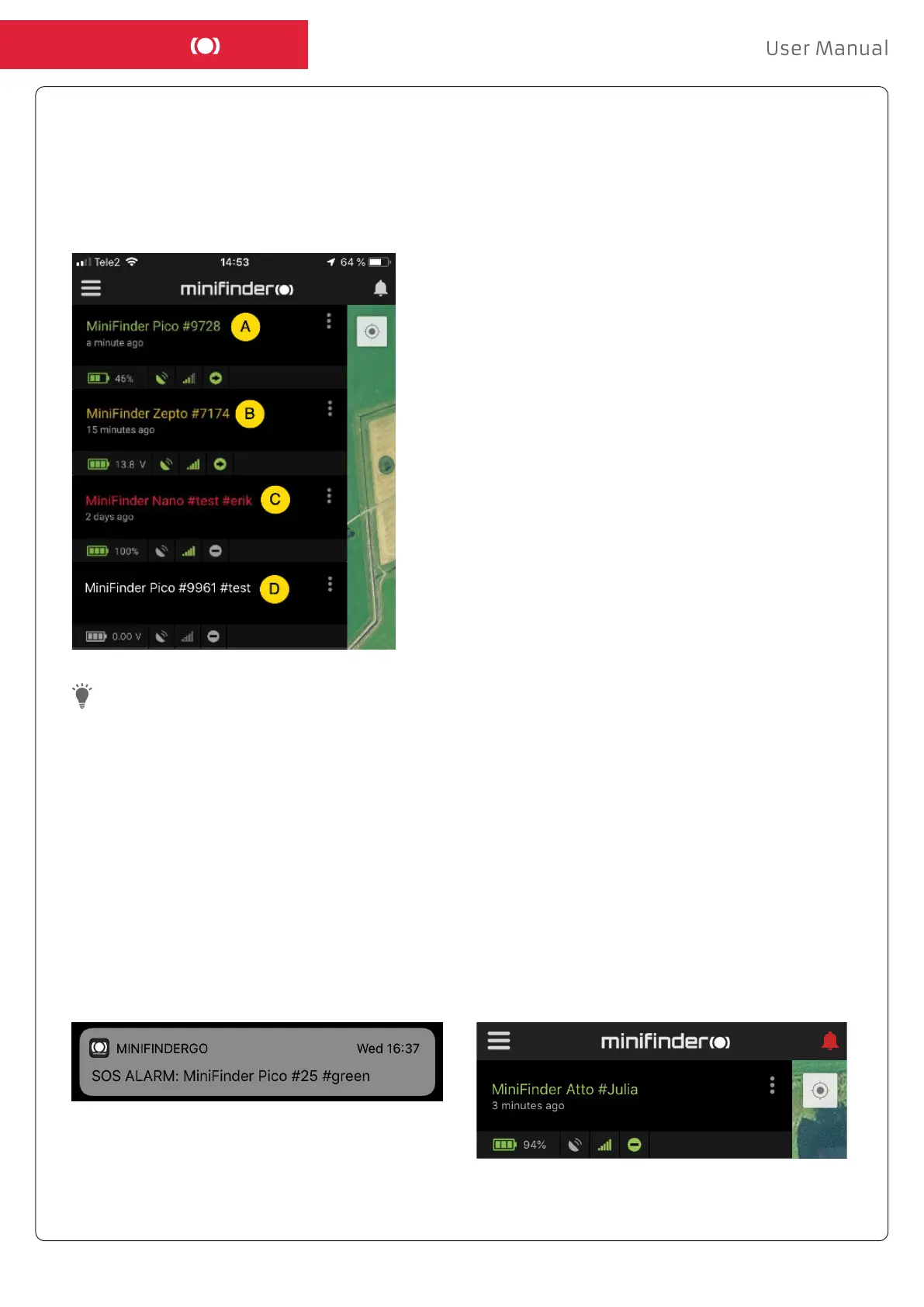 MiniFinder GO APP supports various types of alarms: Geofence alarm, Fall alarm, SOS / Panic alarm,