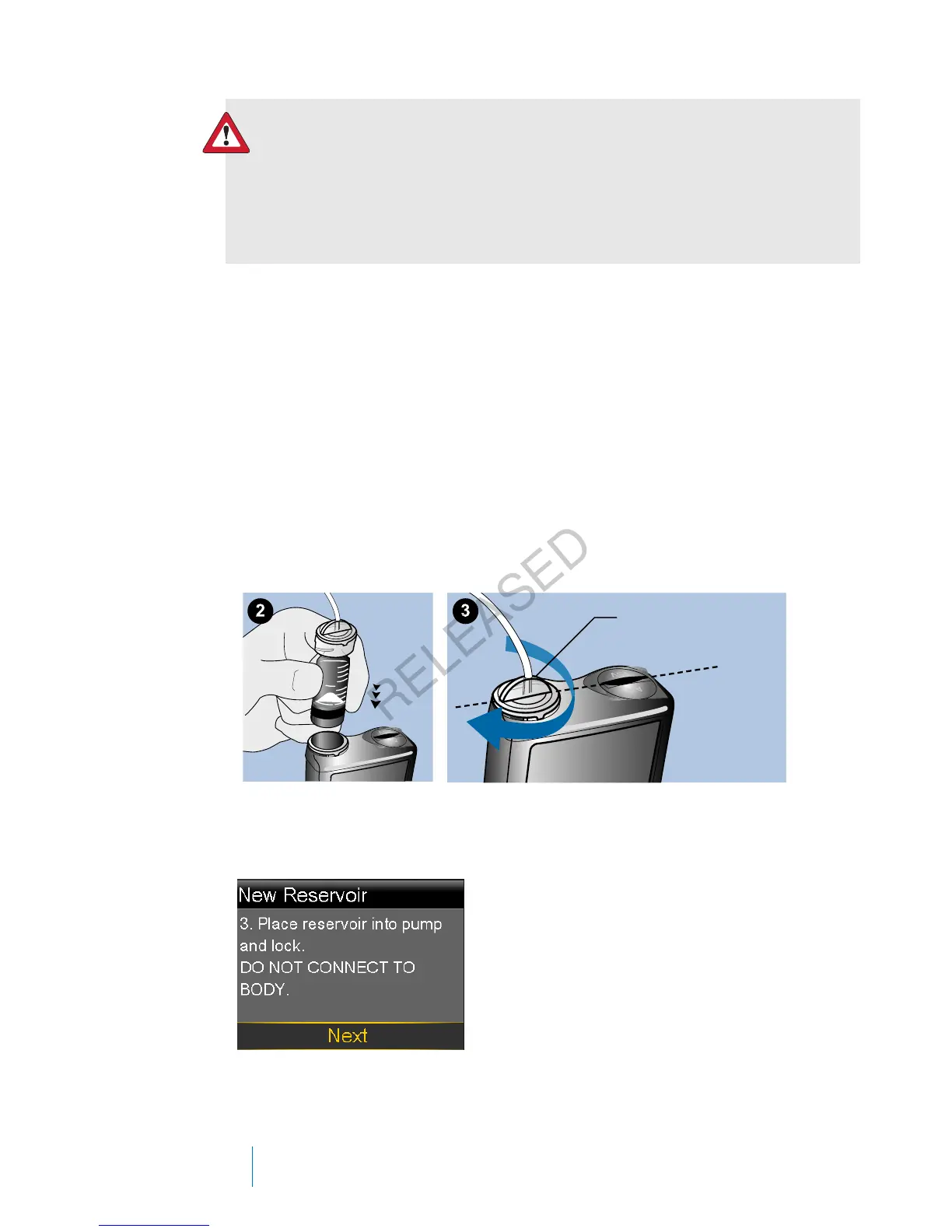 WARNING: Never insert the reservoir into the pump while the