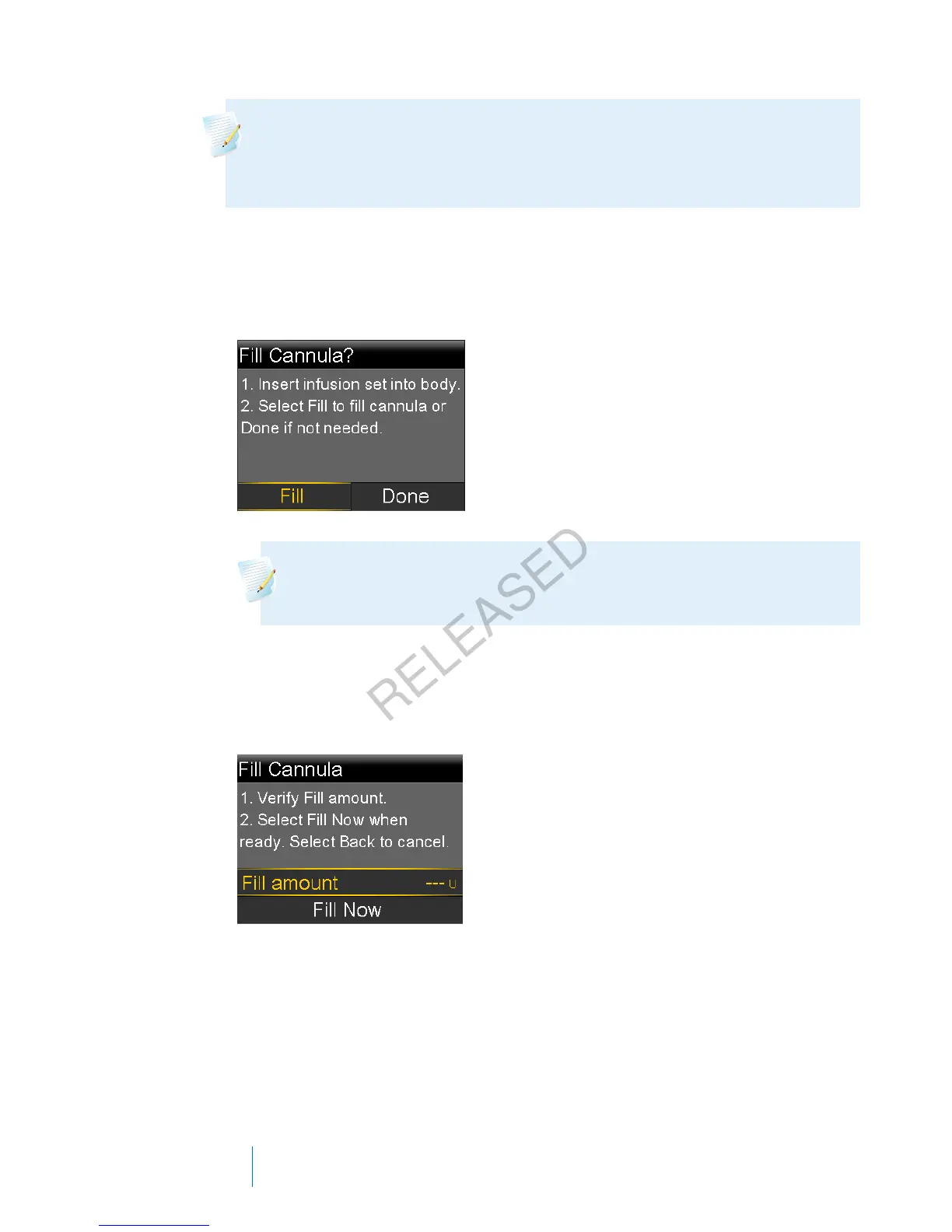 2. To fill your cannula now, select Fill. If you are using an infusion set with a
