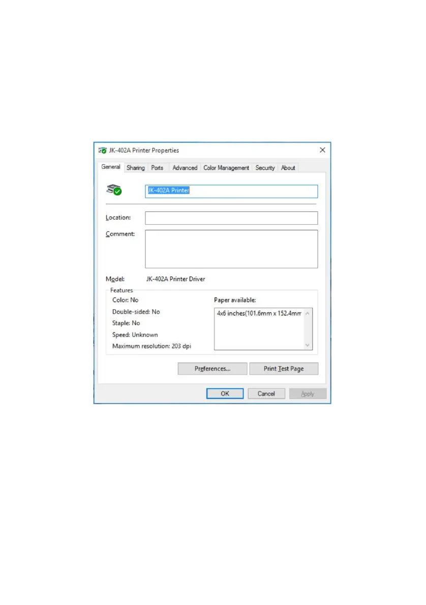 MINJCODE JK-402A - Verifying Printer Installation; Access Printer Properties Window; Printing a Test Page