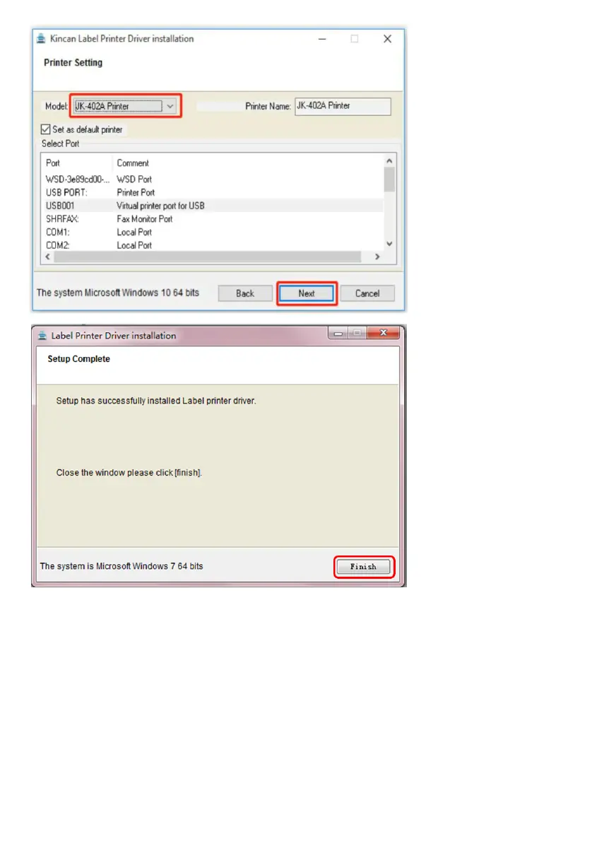 MINJCODE JK-402A - Printer Setup and Port Configuration; Select Printer Port for Connection; Confirm Driver Installation Success