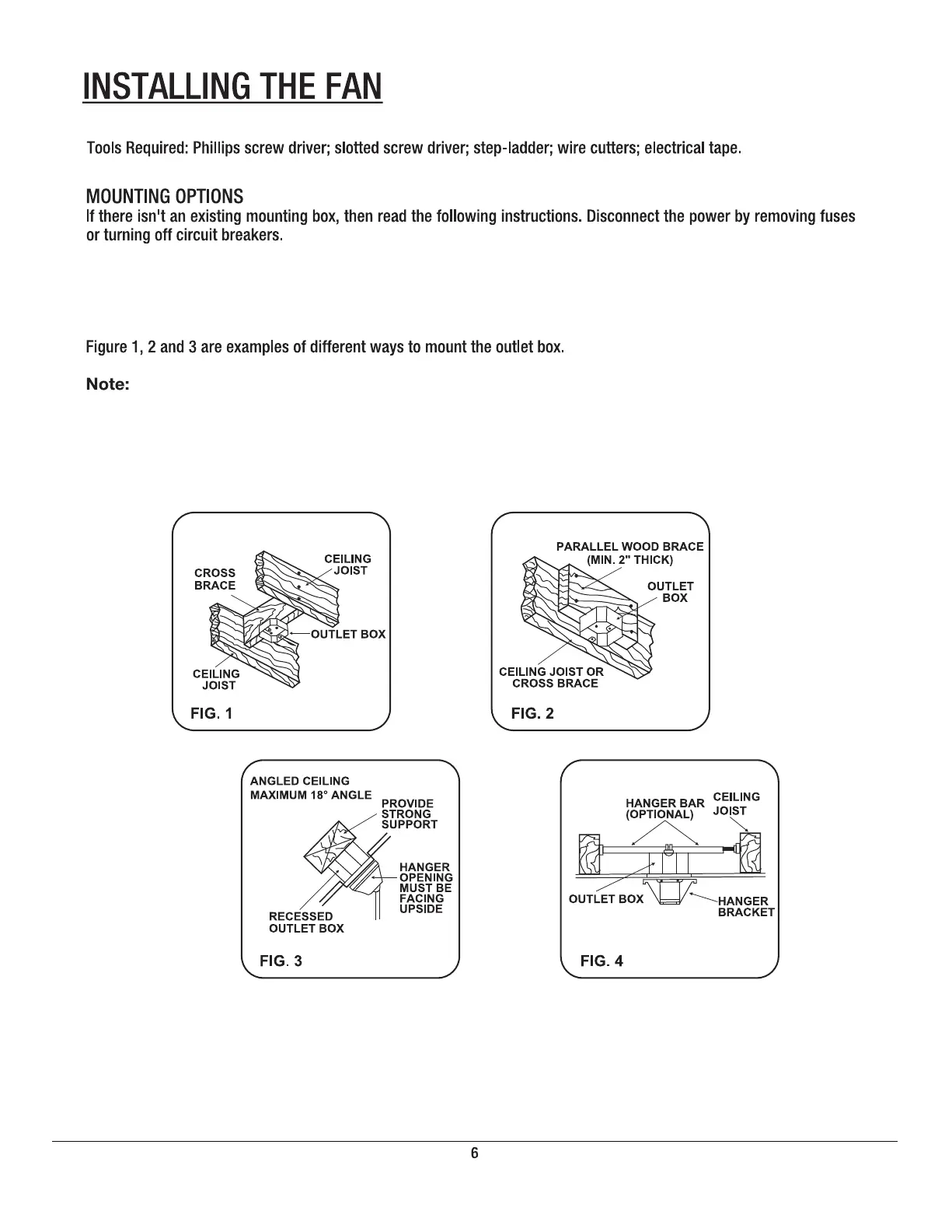 box and its support must be able to fully support the moving weight of the fan (at least 35 Ibs.). Use a UL Listed metal