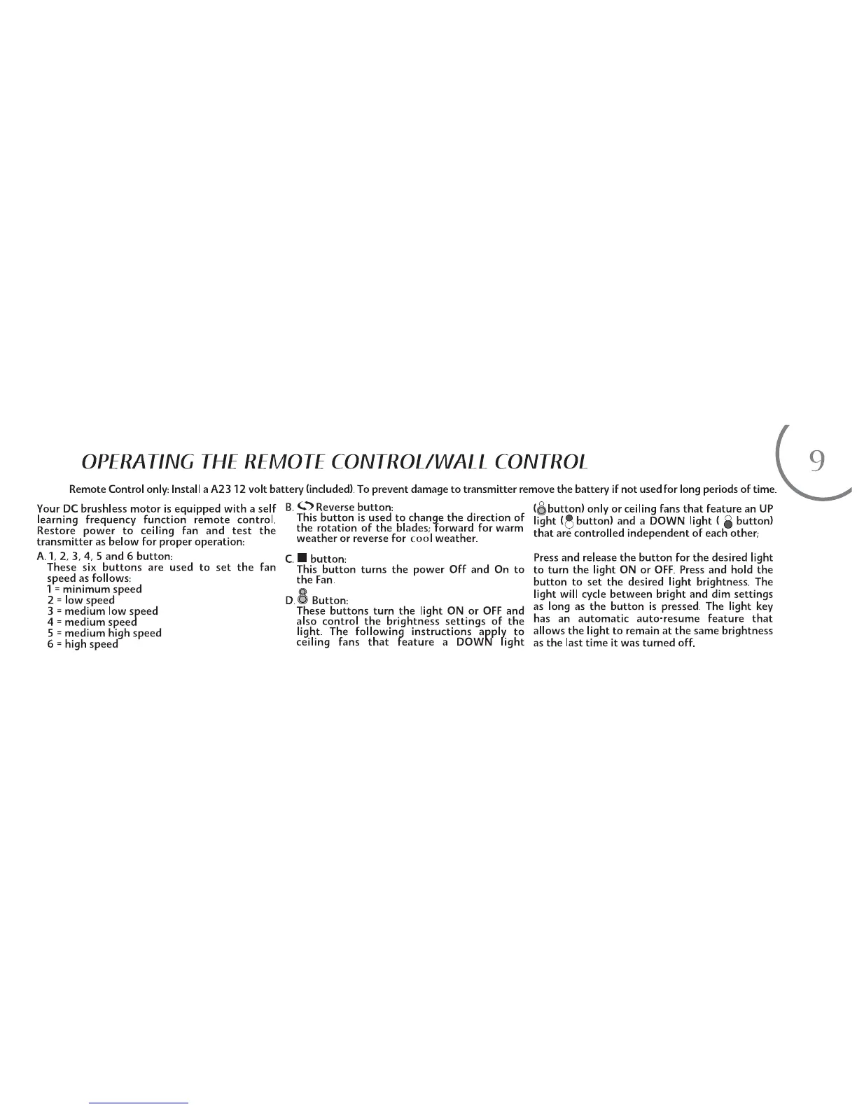 minkaAire simple - Operating the Remote and Wall Control; Remote Control Button Functions