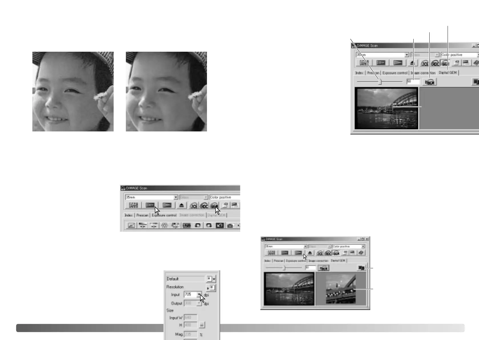 Digital GEM reduces the effect of grain in color film. Grain is a sandy texture that can