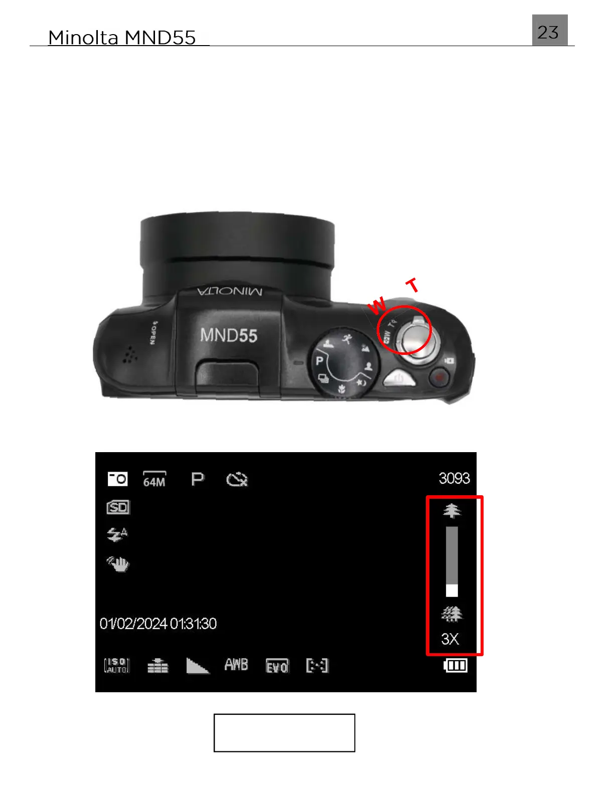 To operate the zoom function, push and hold the T(ele) button lever to zoom in closer