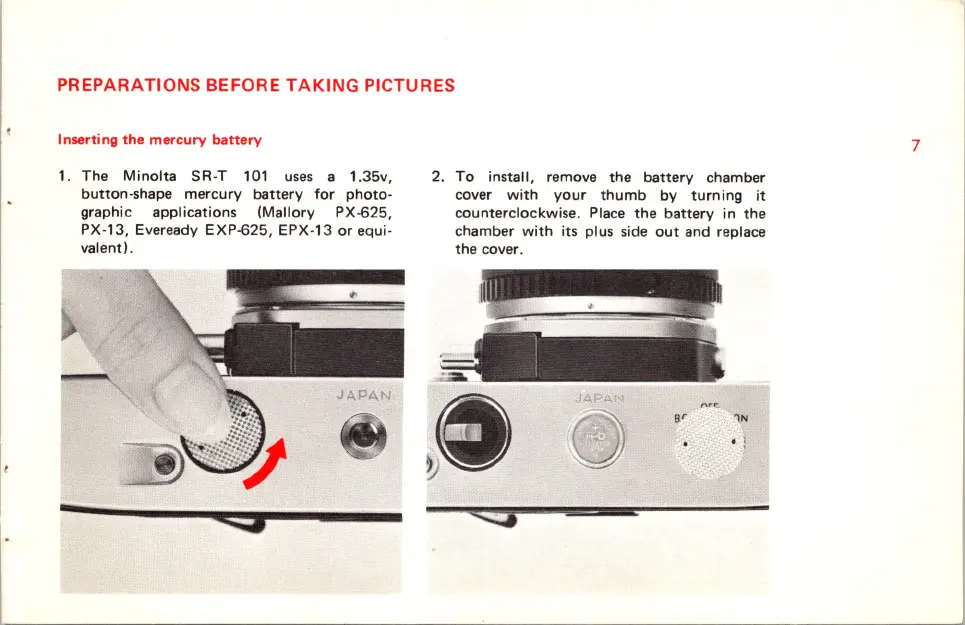 Minolta SR T101 - Preparations before Taking Pictures; Inserting the Mercury Battery