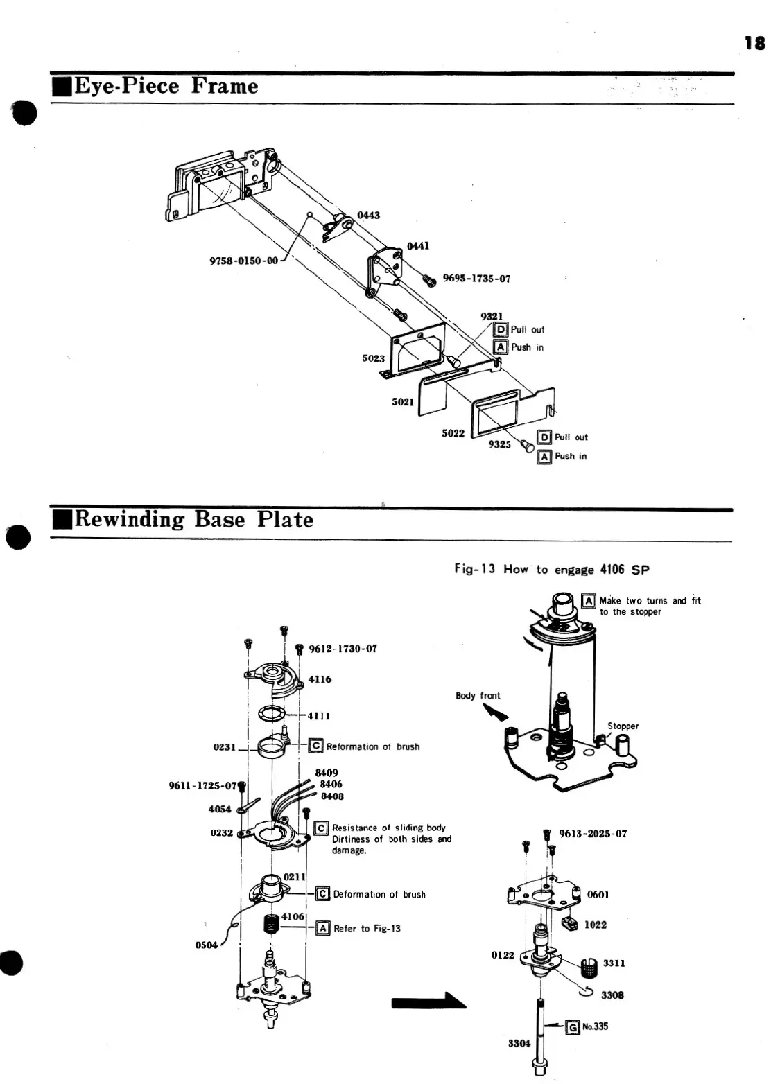 Minolta XE - Eye-Piece Frame; Rewinding Base Plate; Fig-13 How to engage 4106 SP