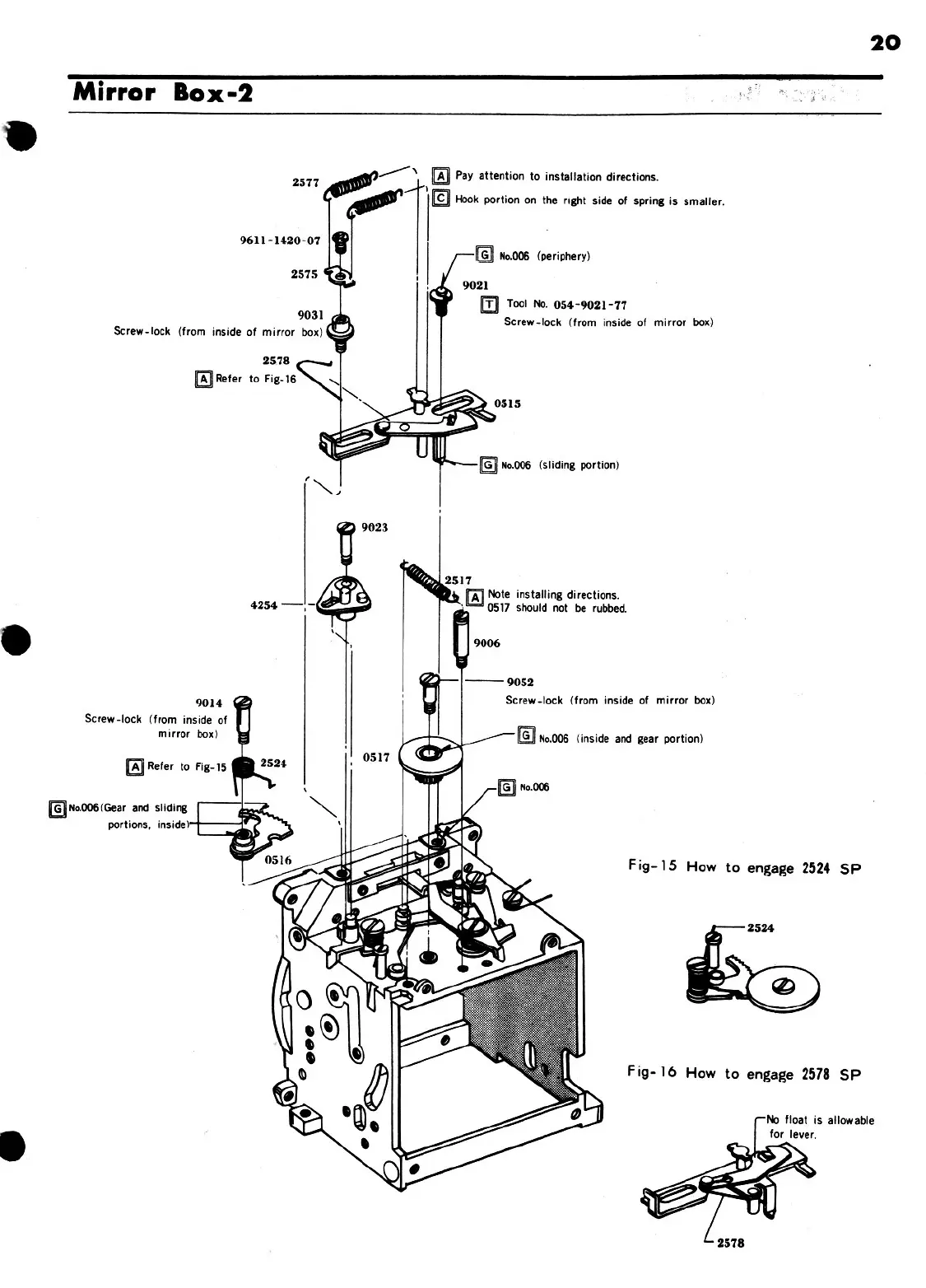 Minolta XE - Mirror Box-2; Fig-15 How to engage 2524 SP; Fig-16 How to engage 2578 SP