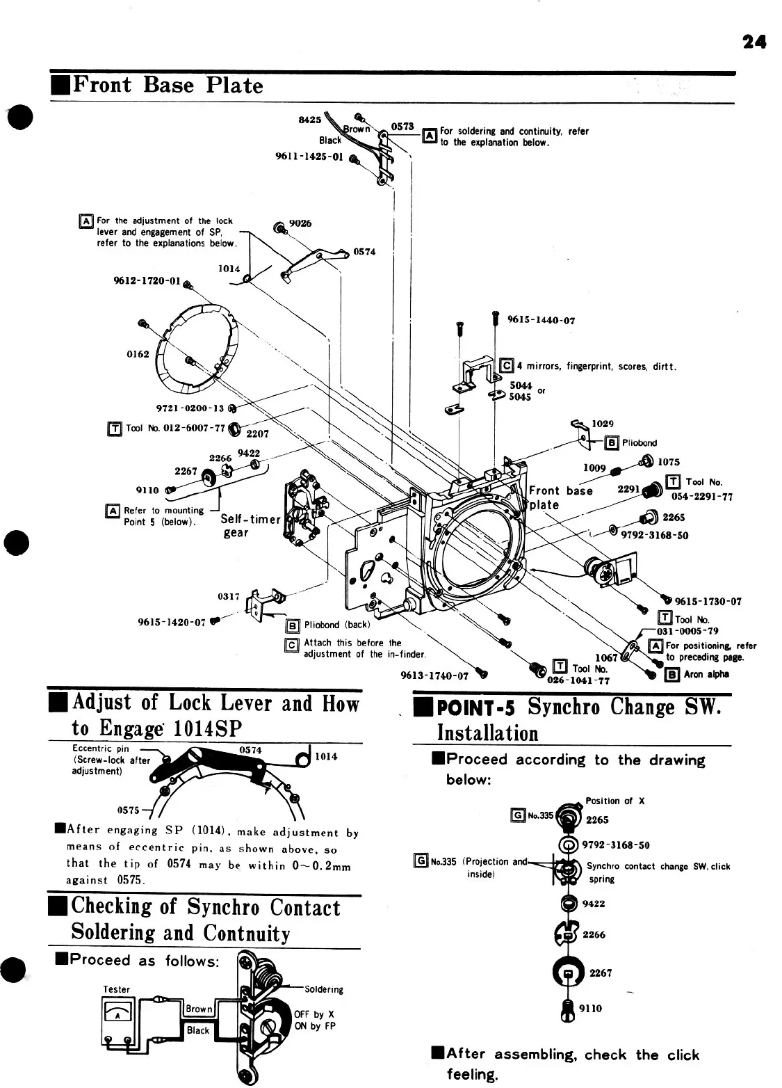 Minolta XE - Front Base Plate; Adjust of Lock Lever and How to Engage 1014 SP; Checking of Synchro Contact Soldering and Continuity; POINT-5 Synchro Change SW. Installation