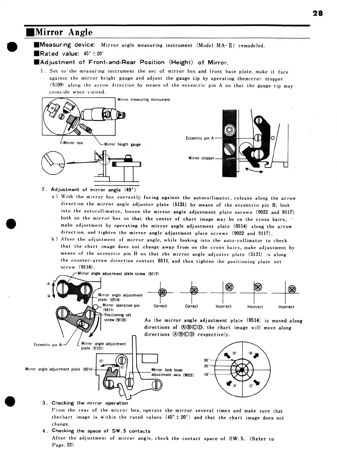 Minolta XE - Mirror Angle; Adjustment of Front-and-Rear Position (Height) of Mirror.; Adjustment of mirror angle (45°); Checking the mirror operation