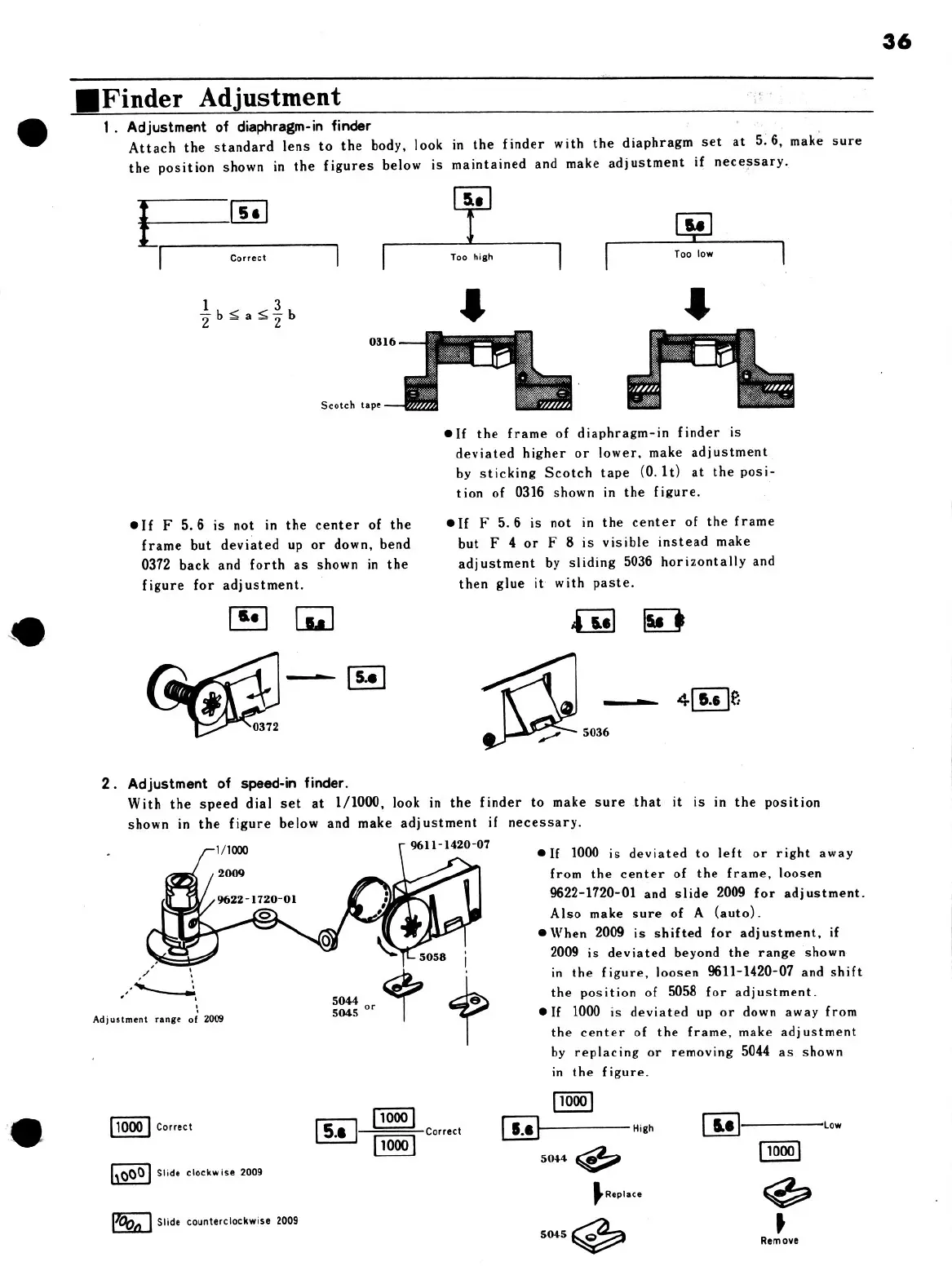 Minolta XE - Finder Adjustment; 1. Adjustment of diaphragm-in finder; 2. Adjustment of speed-in finder