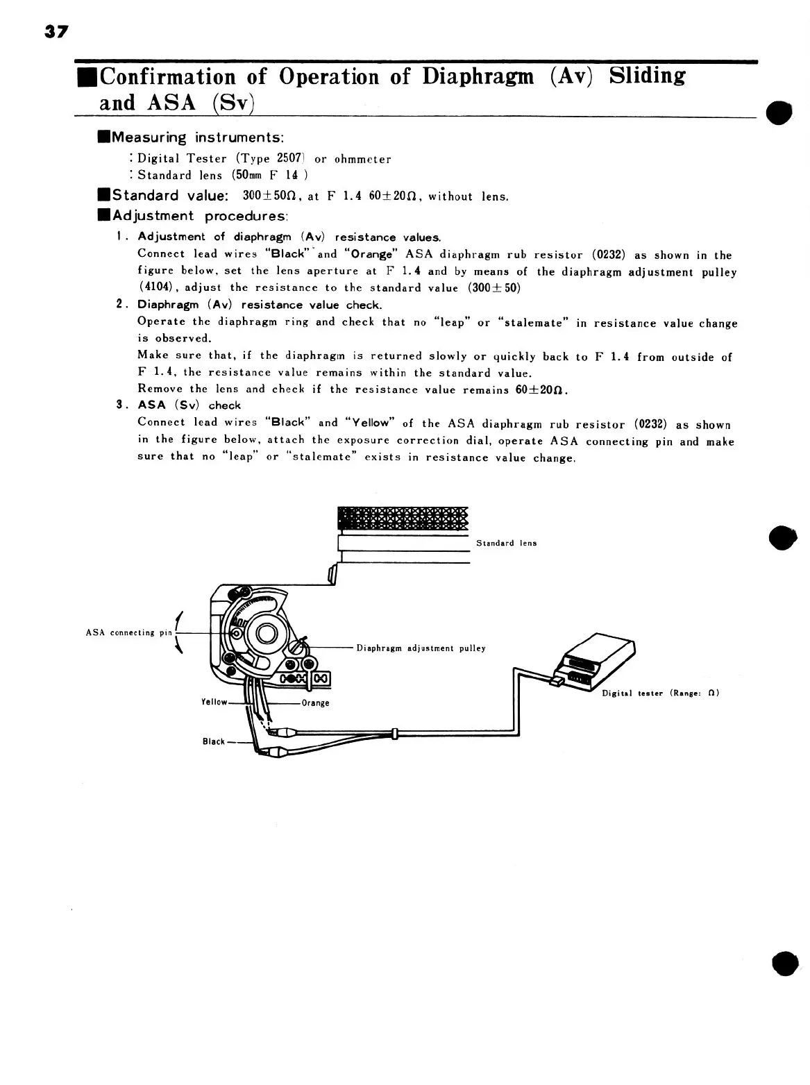 Minolta XE - Confirmation of Operation of Diaphragm (Av) Sliding and ASA (Sv); 1. Adjustment of diaphragm (Av) resistance values; 3. ASA (Sv) check
