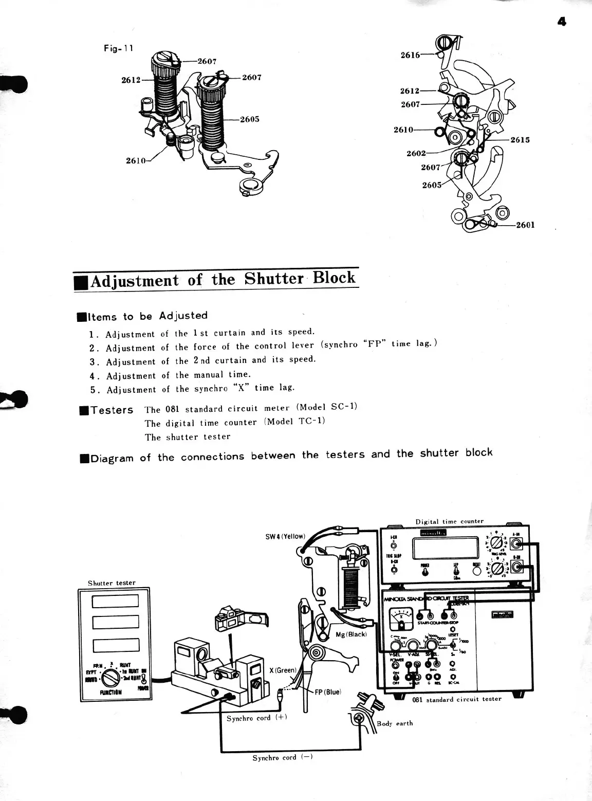 Minolta XE - Adjustment of the Shutter Block; Items to be Adjusted; 1. Adjustment of the 1 st curtain and its speed; 2. Adjustment of the force of the control lever (synchro “FP” time lag)