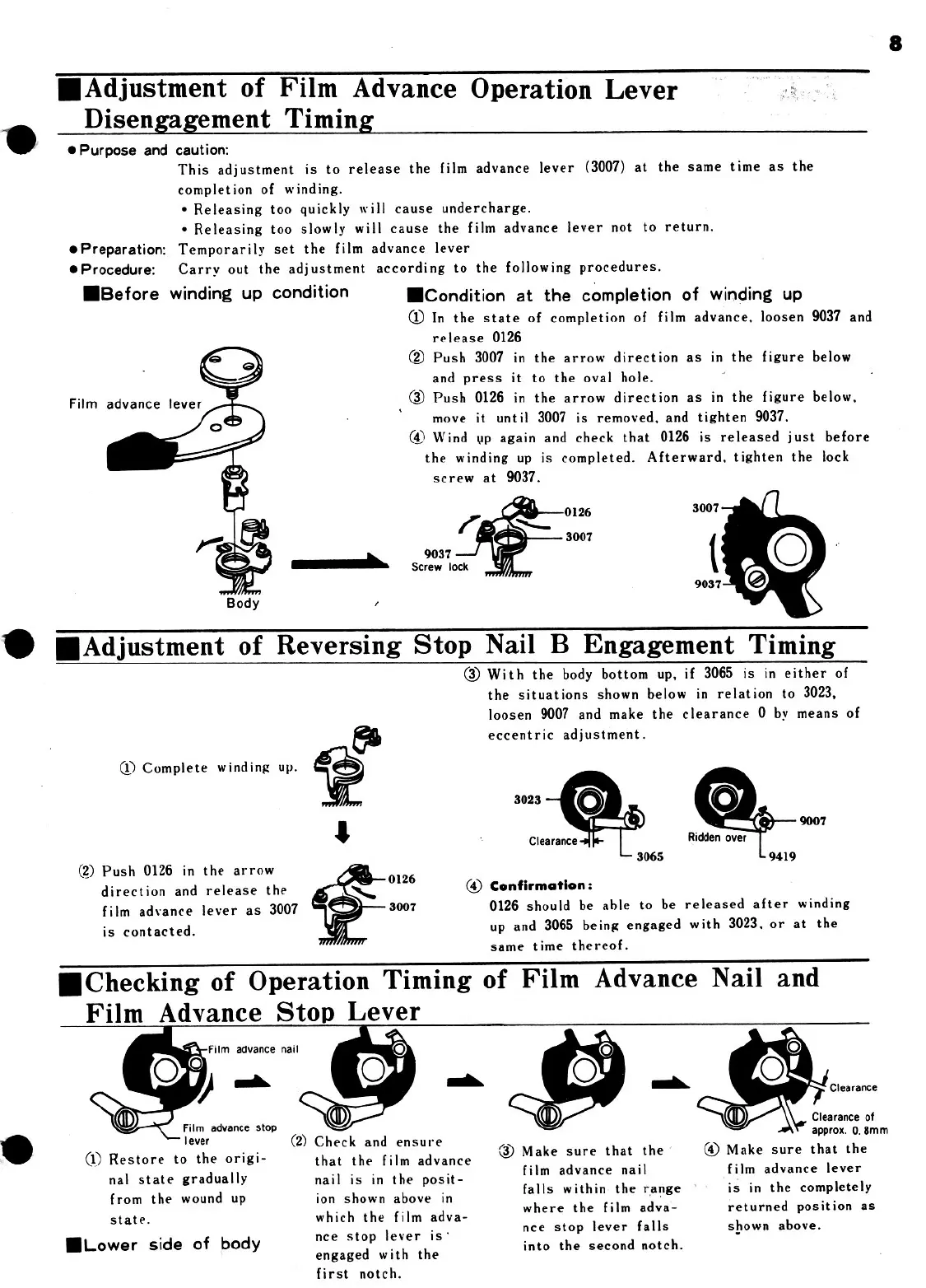 Minolta XE - Adjustment of Film Advance Operation Lever Disengagement Timing; Adjustment of Reversing Stop Nail B Engagement Timing; Checking of Operation Timing of Film Advance Nail and Film Advance Stop Lever