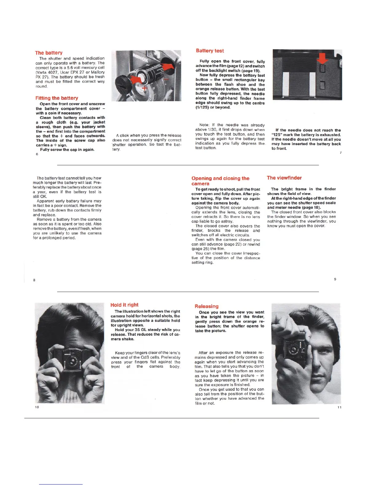 Minox 35 GL - The battery; Fitting the battery; Battery test; Opening and closing the camera