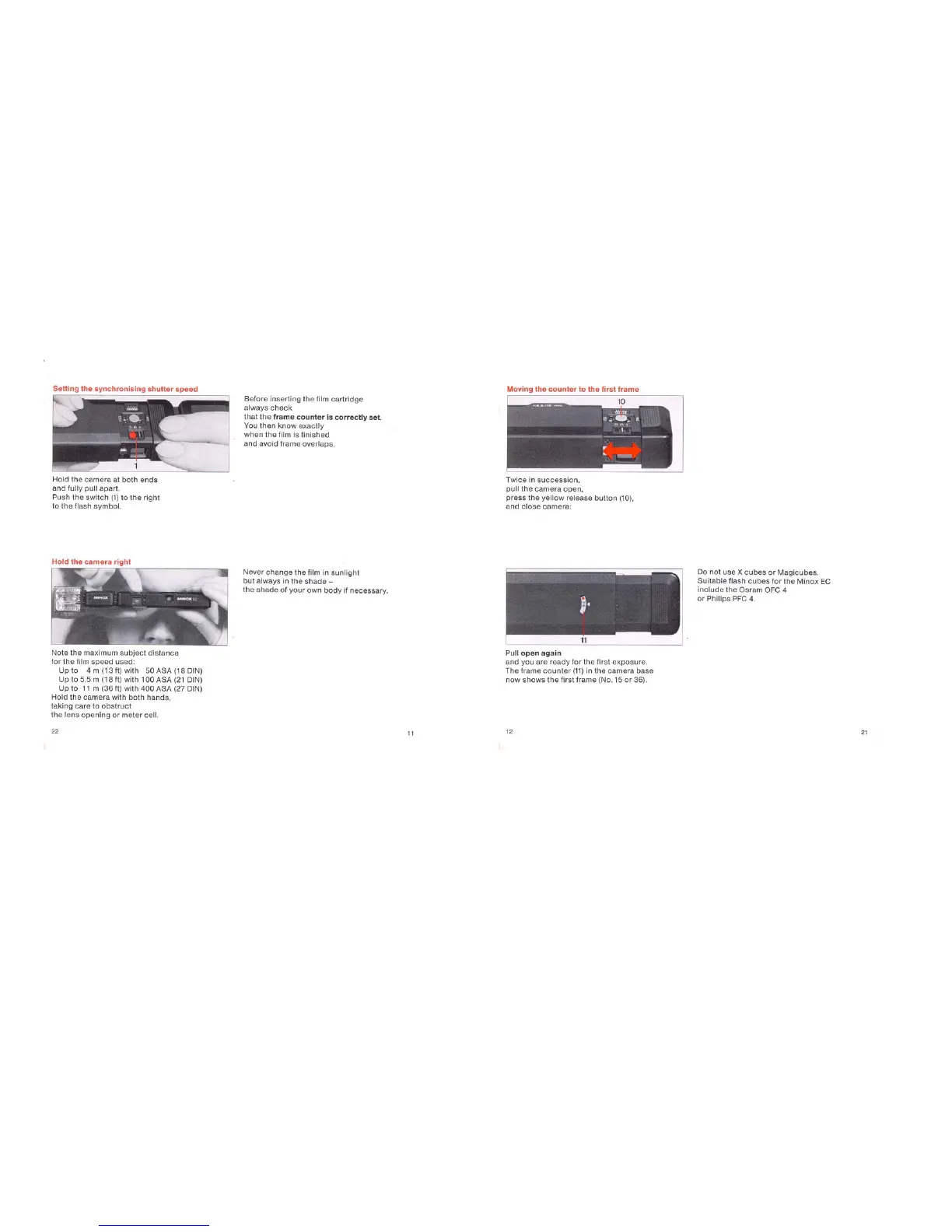 Minox EC - Setting the synchronising shutter speed; Hold the camera right; Moving the counter to the first frame; Pull open again