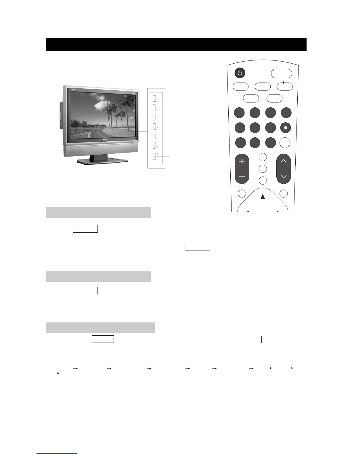 1. Press POWER button on the front panel to turn on the TV set. The POWER indicator lights up