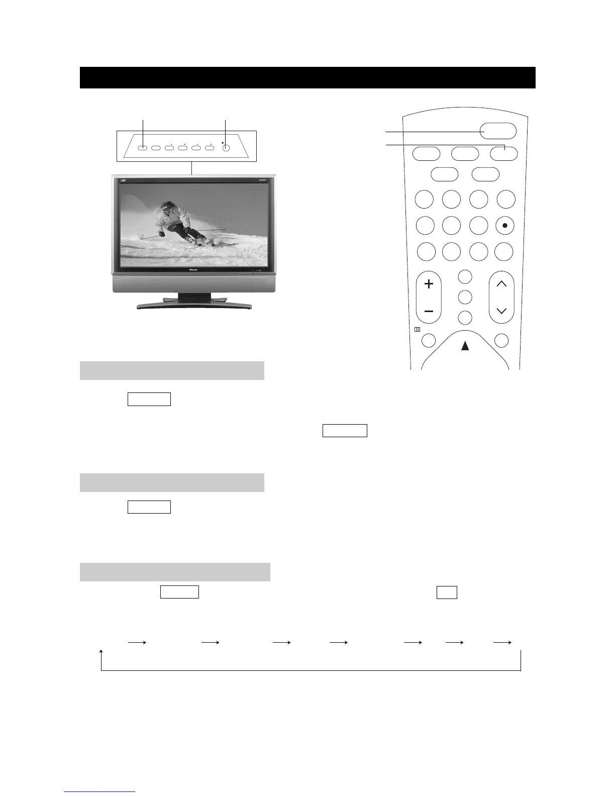 1. Press POWER button on the front panel to turn on the TV set. The POWER indicator lights up