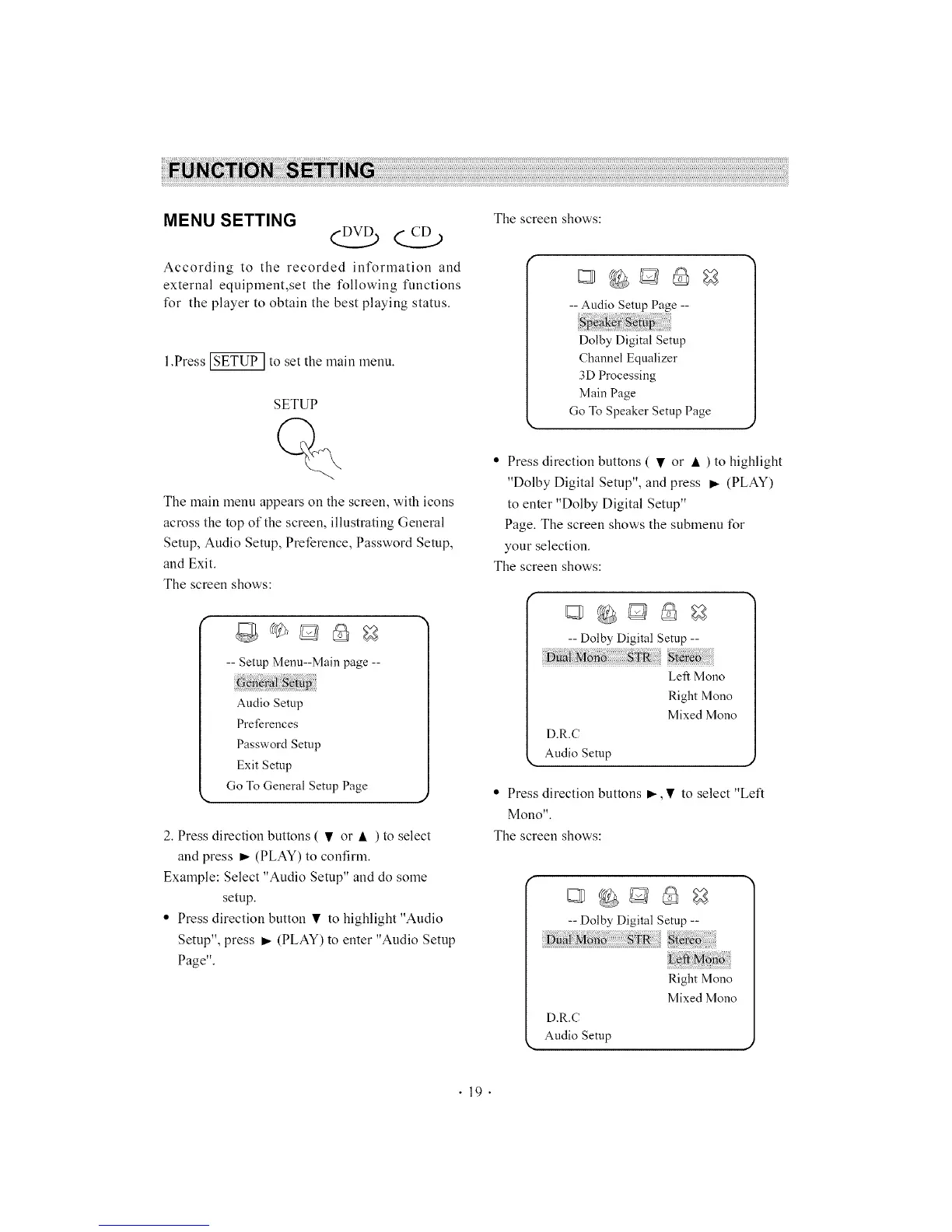 Setup", press m,.(PLAY) to enter "Audio Setup