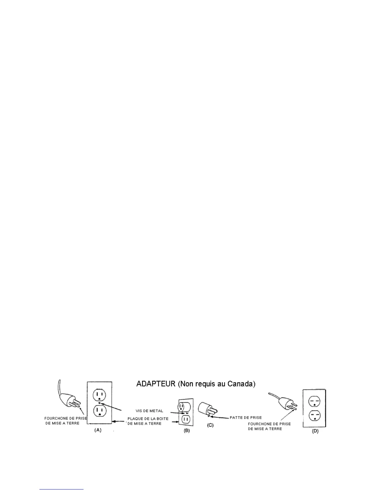 électriques. Cet appareil est muni d’une corde électrique à trois fils et d’un réceptacle à trois fourchons