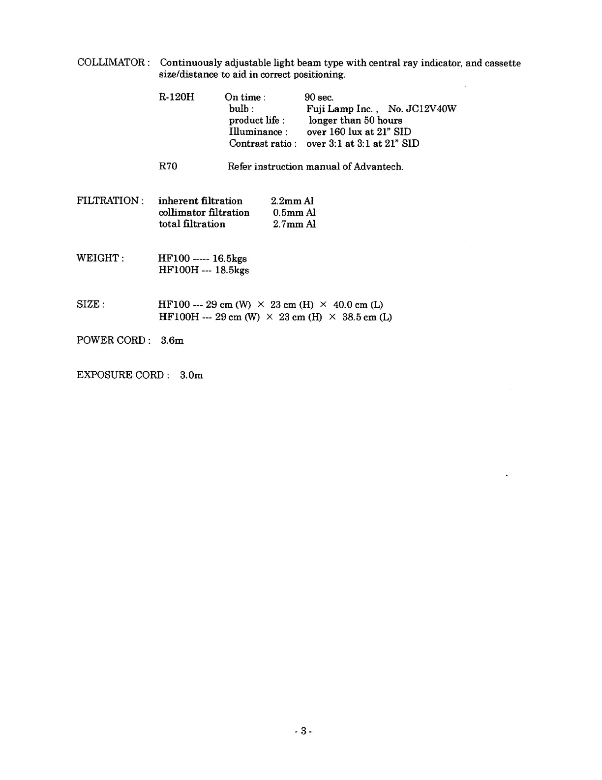 MinXray HF100 - Collimator and Filtration Specifications; Physical Specifications (Weight, Size, Cords)