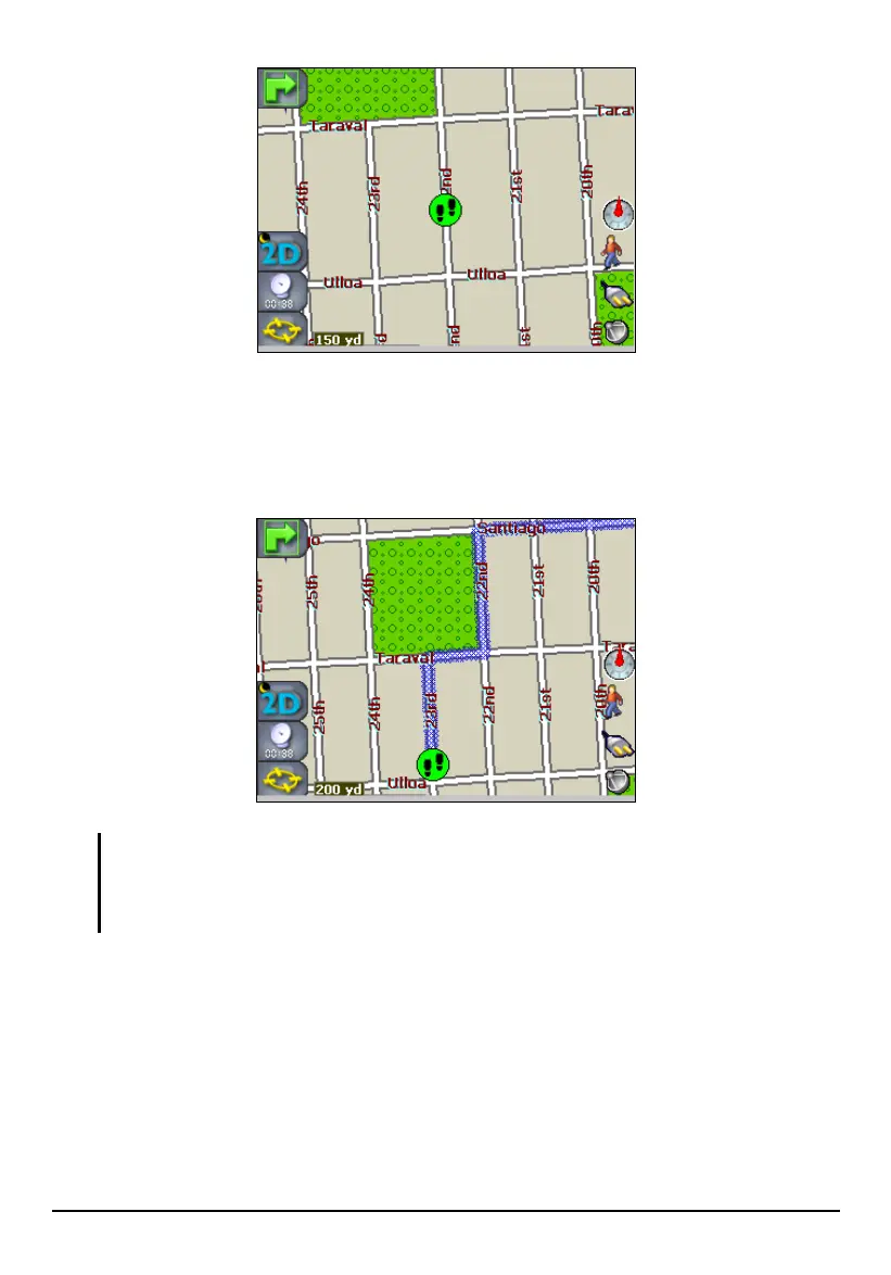 Navigate, Mio Map calculates a route and shows the route in a shaded blue line. You