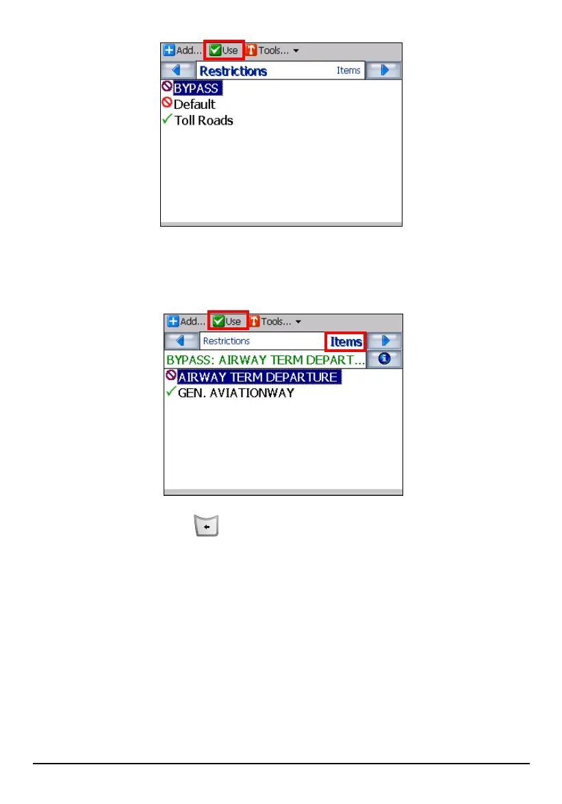 Items. Tap (highlight) the desired road in the list and tap Use or Avoid (top